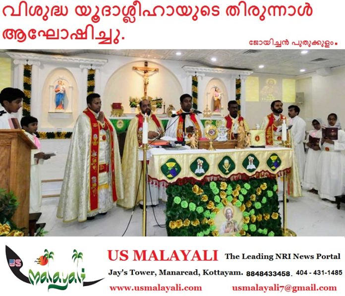 നോർത്തേൺ വിർജിനിയായിലുള്ള സെന്റ് ജൂഡ് ദേവാലയത്തിൽ വിശുദ്ധ യൂദാശ്ലീഹായുടെ തിരുന്നാൾ ഭക്തിപൂർവ്വം ആഘോഷിച്ചു. ഒക്ടോബർ 29ന് ആയിരുന്നു പെരുന്നാൾ ആഘോഷം. ഇടവക രൂപീകരണത്തിന് ശേഷമുള്ള അഞ്ചാമത്തെ തിരുനാളായിരുന്നു ഈ വര്ഷം നടന്നത്. കഴിഞ്ഞ 6 മാസക്കാലമായി ഇടവക വികാരി ഫാ. നിക്കോളാസ് തലകോട്ടൂരിന്റെ നേതൃത്വത്തിൽ പ്രെസുദേന്തിമാരും, ഇടവക ജനങ്ങളും ഇതിനായി പ്രാർത്ഥനയിലൂടെ ഒരുങ്ങുകയായിരുന്നു. ഒക്ടോബർ ഇരുപതാം തീയതി കൊടിയേറ്റത്തോടു കൂടി ഇടവകയുടെ പ്രധാന തിരുന്നാളിന് ആരംഭം കുറിച്ചു. “പാടും പാതിരി” എന്നറിയപ്പെടുന്ന ഫാ.പോൾ പൂവത്തിങ്കലിന്റെ കാർമ്മികത്വത്തിൽ പാട്ടുകുർബാനയോടു കൂടി തിരുക്കർമ്മങ്ങൾക്ക് തുടക്കമായി. തുടർന്നുള്ള ഓരോ ദിവസവും പ്രേത്യേക നിയോഗങ്ങൾ സമർപ്പിച്ചു കൊണ്ടുള്ള കുർബാനയും, വിശുദ്ധനോടുള്ള നൊവേനയും നടത്തപ്പെട്ടു. ഒൻപതു ദിവസത്തെ ഈ കുർബാനയിലും, നൊവേനയിലും, ഫാ .ബെന്നി ജോസ്, ഫാ.ഷെനോയ് ജോൺ , ഫാ.ജോസഫ് അലക്സ് എന്നിവർ പങ്കെടുത്തു. നൊവേനയുടെ ആറാം ദിവസം ഫാ. മനോജ് മാമ്മൻ സിറോമലങ്കര കുർബാനയും ഏഴാം ദിവസം ഫാ.റോബർട്ട് വാഗനെർ ലാറ്റിൻ കുർബാനയും അർപ്പിച്ചു പ്രാർത്ഥിച്ചു. എട്ടാം ദിവസം ആഘോഷമായ സിറോമലബാർ റാസ കുർബാന ഫാ.ഷിമ്മി തോമസിന്റെ നേതൃത്വത്തിൽ, ഫാ.വിൽസൺ ആന്റണി, ഫാ.ജോസഫ് അലക്സ്, ഫാ. ജോബി ,ഫാ.നിക്കോളാസ് എന്നിവർ കൂടി അർപ്പിച്ചു. വിശുദ്ധ കുർബാനക്ക് ശേഷം ഭക്തി നിർഭരമായ വിശുദ്ധ കുർബാനയുടെ എഴുന്നെള്ളിപ്പും, പ്രദിക്ഷണവും നടത്തപ്പെട്ടു. അത്താഴ വിരുന്നോടു കൂടി ആ ദിവസത്തെ തിരുക്കർമങ്ങൾ സമാപിച്ചു. ഈ വര്ഷം ആഗോള സഭ വിശുദ്ധ കുർബാനയുടെ വർഷമായി ആചരിക്കുന്നത് കൊണ്ട് 9 ദിവസത്തെ നൊവേന ദിനങ്ങളിൽ കുമ്പസാരം, സ്തൈര്യലേപനം , മാമോദീസ, രോഗീലേപനം, വിവാഹം, വിശുദ്ധ കുർബാന, കുർബാനയും സഭയും, ഹോളി ഓർഡർ എന്നീ വിഷയങ്ങളിലൂന്നിയുള്ള സന്ദേശങ്ങളും നൽകുകയുണ്ടായി. പ്രധാന തിരുന്നാൾ ദിവസം ആയ 29 -ആം തീയതി ഫാ.ഡിജോ കോയിക്കര ആഘോഷ പൂർവമായ പാട്ടു കുർബാനക്ക് നേതൃത്വം നൽകി. വിശുദ്ധന്റെ തിരുസ്വരൂപം വഹിച്ചു കൊണ്ടുള്ള ഭക്തി സാന്ദ്രമായ രഥ പ്രദിക്ഷണവും, തിരുശേഷിപ്പ് വണക്കവും ആഘോഷങ്ങൾക്ക് മികവേകി.