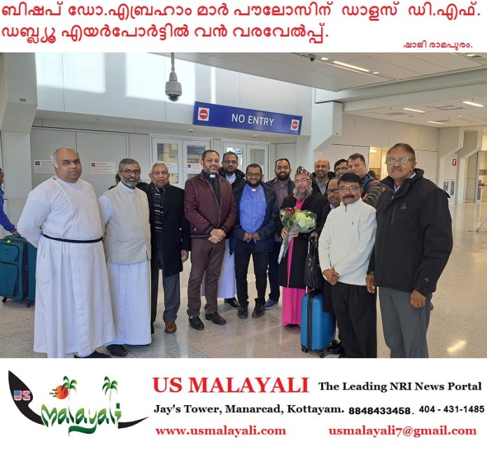 ഡാളസ് : മാർത്തോമ്മാ സഭയുടെ നോർത്ത് അമേരിക്ക ഭദ്രാസനാധിപനായി പുതിയതായി ചുമതല ഏറ്റെടുത്ത ശേഷം ഡാളസിൽ ആദ്യമായി എത്തിച്ചേർന്ന ബിഷപ് ഡോ.എബ്രഹാം മാർ പൗലോസിന് ഡാളസ് ഡി.എഫ്. ഡബ്ല്യൂ രാജ്യാന്തര വിമാനത്താവളത്തിൽ വൻ വരവേൽപ്പ് നൽകി.