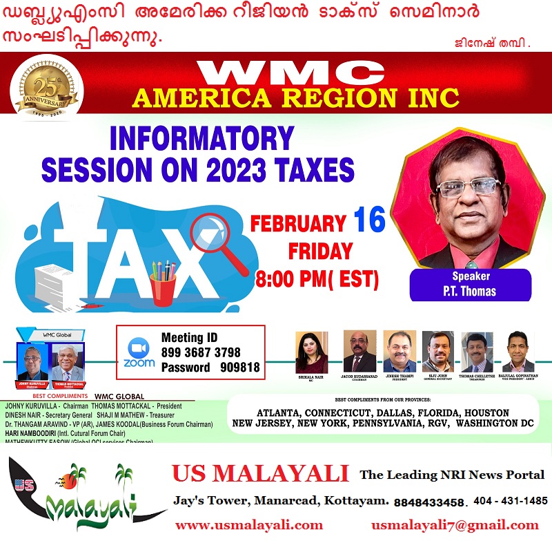 ന്യൂജേഴ്സി : 2023 ടാക്സ് ആസ്പദമാക്കി ഡബ്ല്യുഎംസി അമേരിക്ക റീജിയൻ ഫെബ്രുവരി പതിനാറാം തീയതി വൈകുന്നേരം എട്ട് മണിക്ക് സൂം മുഖേന ടാക്സ് സെമിനാർ സംഘടിപ്പിക്കുന്നു