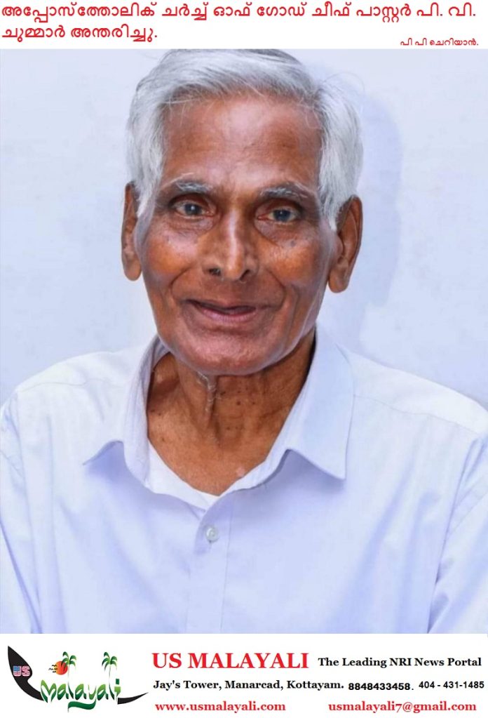 പഴഞ്ഞി(തൃശൂർ) : ക്രൈസ്തവ ഗാനരചയിതാവും , അപ്പൊസ്തൊലിക്ക് ചർച്ച് ഓഫ് ഗോഡ് അധ്യക്ഷനുമായ പാസ്റ്റർ പി.വി.ചുമ്മാർ (92) അന്തരിച്ചു.ഇന്ത്യൻ സമയം മാർച്ച് 14 ബുധനാഴ്ച രാവിലെ പഴഞ്ഞി ഫൈത് ഹോമിൽ വെച്ചായിരുന്നു മരണം സംഭവിച്ചത് .പഴഞ്ഞി പുലിക്കോട്ടിൽ വറുതുണ്ണി – ചെറിച്ചി ദമ്പതികളുടെ മകനായി 1932 ഓഗസ്റ്റ് 20നാണ് ജനനം.