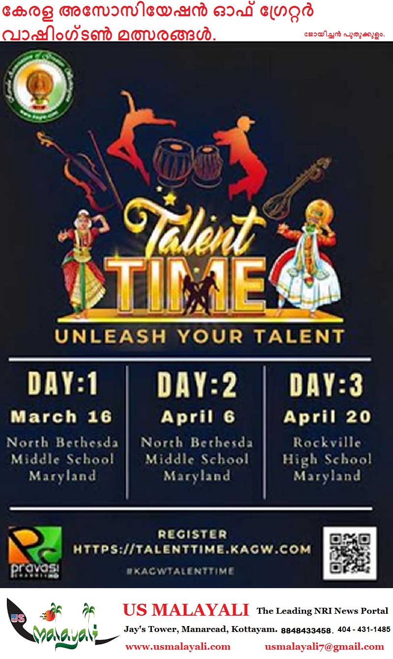 വാഷിംഗ്ടണ്: കേരള അസോസിയേഷന് ഓഫ് ഗ്രേറ്റര് വാഷിംഗ്ടണ് (കെഎജിഡബ്ല്യു) ഗ്രേറ്റര് വാഷിംഗ്ടണ് ഡിസി ഏരിയയിലെ യുവജനങ്ങള്ക്കായി ടാലന്റ് ടൈം, സാഹിത്യ, ഫൈന് ആര്ട്സ്, പെര്ഫോമിംഗ് ആര്ട്സ് മത്സരങ്ങള് സംഘടിപ്പിക്കുന്നു. 2007-ല് ഈ മത്സരത്തിന് വിനീതമായ തുടക്കമായിരുന്നു. 2008-ല് കേരളത്തിലെ യുവജനോത്സവങ്ങള്ക്ക് ശേഷം ഇത് പുനഃക്രമീകരിക്കപ്പെട്ടു, അതിനുശേഷം ഗ്രേറ്റര് വാഷിംഗ്ടണ് ഡിസി ഏരിയയില് നിന്നുള്ള വിവിധ വംശീയ പശ്ചാത്തലങ്ങളില് നിന്നുള്ള പങ്കാളികളെ ആകര്ഷിക്കുന്ന ഒരു പ്രധാന മള്ട്ടി-കള്ച്ചറല് മത്സരമായി പരിണമിച്ചു. ഈ വര്ഷം 30 ഇനങ്ങളിലായി മാര്ച്ച് 16, ഏപ്രില് 6, ഏപ്രില് 20 തീയതികളില് നോര്ത്ത് ബെഥെസ്ഡ മിഡില് സ്കൂള്, മേരിലാന്ഡിലെ റോക്ക്വില്ലെ ഹൈസ്കൂള് എന്നിവിടങ്ങളില് 800 ഓളം പേര് പങ്കെടുക്കുമെന്ന് പ്രതീക്ഷിക്കുന്നു.
