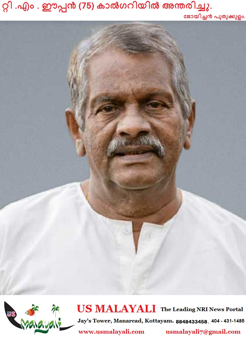 കാൽഗറി : റാന്നി മുക്കാലുമൺ തെങ്ങുംതറയിൽ റ്റി .എം . ഈപ്പൻ( മോനുക്കുട്ടൻ (75)) കാൽഗറിയിൽ അന്തരിച്ചു .ഇടമൺ നായ്ക്കംപറമ്പിൽ കുമ്പിളുനിൽക്കുന്നതിൽ കുടുംബാംഗമായ പരേതയായ ശോശാമ്മ ഈപ്പനായിരുന്നു ഭാര്യ .