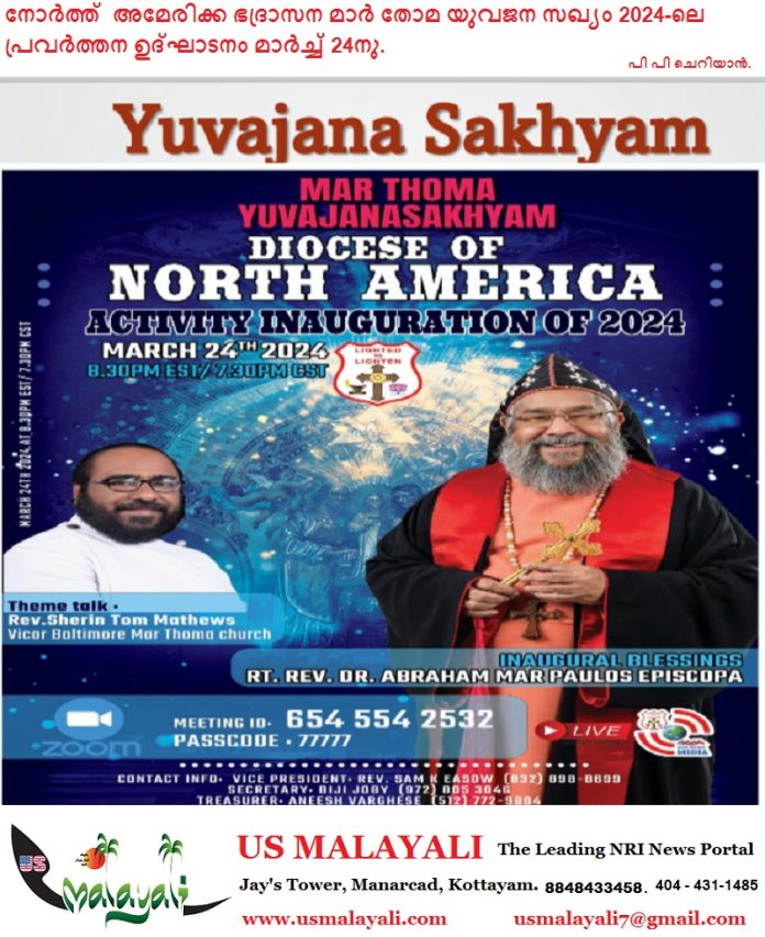 ന്യൂയോർക് :നോർത്ത് അമേരിക്ക ഭദ്രാസന മാർ തോമ യുവജന സഖ്യം 2024-ലെ പ്രവർത്തന ഉദ്ഘാടനം മാർച്ച് 24നു വെള്ളിയാഴ്ച 8.30PM EST/7:30PM സൂം ഫ്ലാറ്റ് ഫോമിൽ വെച്ച് നടക്കുന്നു .ഭദ്രാസന എപ്പിസ്കോപ്പ റൈറ്റ് . റവ ഡോ എബ്രഹാം മാർ പൗലോസ് എപ്പിസ്കോപ്പ ഉദ്ഘാടനം നിർവഹിക്കുന്ന സമ്മേളനത്തിൽ റവ.ഷെറിൻ ടോം മാത്യൂസ് (വികാരി ബാൾട്ടിമോർ മാർത്തോമ്മാ പള്ളി) തീം ടോക്ക് നടത്തും.സമ്മേളനത്തിൽ ഭദ്രാസനത്തിലെ എല്ലാ യുവജനങ്ങളും പ്രാർത്ഥനാപൂർവ്വം പങ്കെടുക്കണമെന്ന് സംഘാടകർ അഭ്യത്ഥിച്ചു