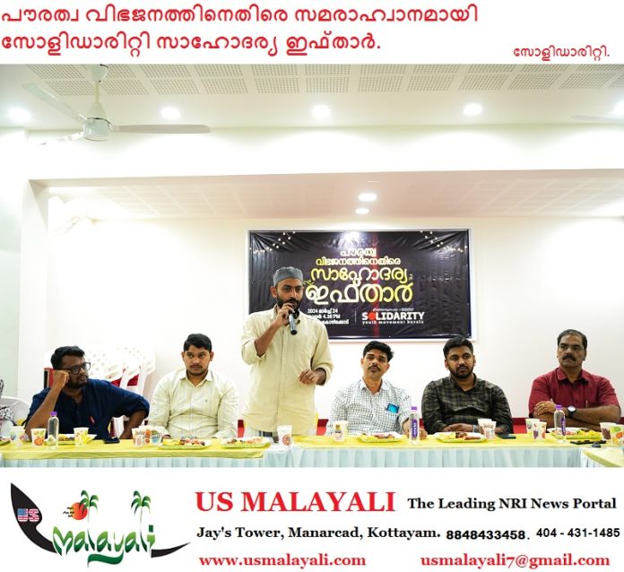കോഴിക്കോട്: പൗരത്വ വിഭജനത്തിനെതിരെ സമരാഹ്വാനവുമായി സോളിഡാരിറ്റി യൂത്ത്മൂവ്മെന്റ് സംഘടിപ്പിച്ച സാഹോദര്യ ഇഫ്താർ. വിവിധ രാഷ്ട്രീയ-മത-സാംസ്കാരിക- കലാ മേഖലകളിൽനിന്നുളള പ്രഗദ്ഭർ പങ്കെടുത്തു. ഇന്ത്യ എന്ന ആശയം നിലനിൽക്കണോ എന്ന ചോദ്യത്തെ അഭിമുഖീകരിക്കുന്ന സന്ദർഭത്തിൽ കൂടുതൽ ജാഗ്രതയോടെ നാം നിലകൊള്ളണമെന്ന് സംഗമം ആഹ്വാനം ചെയ്തു. ഡോ. പി.കെ. സാദിഖ് വിഷയം അവതരിപ്പിച്ച് സംസാരിച്ചു. സോളിഡാരിറ്റി സംസ്ഥാന പ്രസിഡന്റ് സി.ടി. സുഹൈബ് അധ്യക്ഷത വഹിച്ചു. സംസ്ഥാന ജനറൽ സെക്രട്ടറി തൗഫീഖ് മമ്പാട് ആമുഖ ഭാഷണം നടത്തി. യൂത്ത് ലീഗ് സംസ്ഥാന വൈസ് പ്രസിഡന്റ് മുജീബ് കാടേരി, ഐ.എസ്.എം സംസ്ഥാന പ്രസിഡന്റ് സഹൽ മുട്ടിൽ, ഫ്രറ്റേണിറ്റി സംസ്ഥാന പ്രസിഡന്റ് ഷെഫ്രിൻ കെ.എം, ഐ.എസ്.എം സംസ്ഥാന ട്രഷറർ കെ.എം.എ. അസീസ്, എം.ഇ.എസ് യൂത്ത് വിങ് സംസ്ഥാന പ്രസിഡന്റ് ശാഫി, എൻ.വൈ.എൽ സംസ്ഥാന വൈസ് പ്രസിഡന്റ് അശ്റഫ് പുതുമ, ശബാബ് എഡിറ്റർ സുഫ്യാൻ അബ്ദുസ്സത്താർ, എൻ.വൈ.എൽ (വഹാബ് വിഭാഗം) സംസ്ഥാന ജനറൽ സെക്രട്ടറി ഒ.പി. റഷീദ്, കെ.എൽ.സി.എ സംസ്ഥാന വൈസ് പ്രസിഡന്റ് ബിനു എഡ്വേർഡ്, സംവിധായകൻ അരുൺ രാജ്, പ്രഭാഷകനും എഴുത്തുകാരനുമായ റിയാസ് ഗസാലി, അംബിക മറുവാക്ക്, വിമൺ ജസ്റ്റിസ് മൂവ്മെന്റ് സംസ്ഥാന ജനറൽ സെക്രട്ടറി ഫസ്ന മിയാൻ, മാധ്യമ പ്രവർത്തകൻ സിദ്ധീഖ് കാപ്പൻ, ഭാര്യ റൈഹാന കപ്പൻ, ഗവേഷക വിദ്യാർഥി സീന പനോലി, മുഹമ്മദ് അസ്ലം, സംവിധായകൻ ഹർഷദ്, സാമൂഹ്യ പ്രവർത്തകൻ ഇർഷാദ് മൊറയൂർ, ജംഷീദ് പള്ളിപ്രം, എഴുത്തുകാരനും സാമൂഹ്യ പ്രവർത്തകനുമായ കെ.കെ. ബാബുരാജ്, അദർ ബുക്സ് മാനേജിങ് എഡിറ്റർ ഔസാഫ് അഹ്സൻ, വിസ്ഡം യൂത്ത് സംസ്ഥാന സമിതി അംഗം അജ്മൽ സി, എഴുത്തുകാരൻ മമ്മൂട്ടി അഞ്ചുകുന്ന്, മാധ്യമ പ്രവർത്തകൻ ബാബുരാജ് ഭഗവതി, മുഫ്തി അമീൻ മാഹി, എഴുത്തുകാരായ റഷീദ് മക്കട, ബഷീർ തൃപ്പനച്ചി, എഴുത്തുകാരൻ ഡോ. കെ. ജയസൂര്യ എന്നിവർ സംസാരിച്ചു.