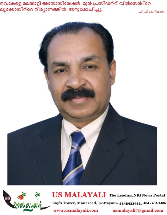 സൗത്ത് ഫ്ളോറിഡ:നവകേരള മലയാളീ അസോസിയേഷൻ ഓഫ് സൗത്ത് ഫ്ളോറിഡയുടെ മുൻ പ്രസിഡന്റ് വിൻസെന്റ് ലൂക്കോസ് വേലശേരിയുടെ(67)നിര്യാണത്തിൽ സംഘടന അനുശോചിച്ചു. നവകേരളയുടെ വളർച്ചക്കും ഉന്നമനത്തിനായി പ്രവർത്തിച്ച മഹദ്വ്യക്തി ആയിരുന്നു ശ്രീ വിൻസെൻ്റെ എന്ന് പ്രസിഡന്റ് പനങ്ങയിൽ ഏലിയാസ് അനുസ്മരിച്ചു.