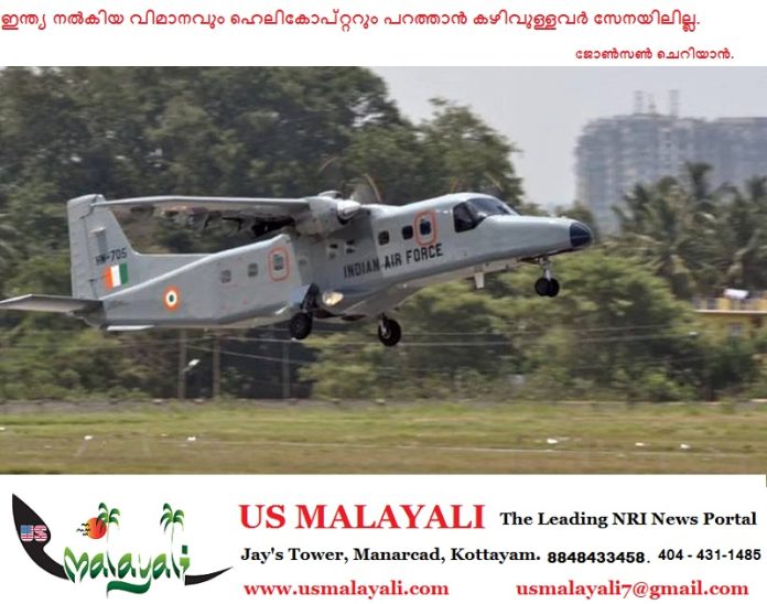 ഇന്ത്യ നൽകിയ വിമാനങ്ങളും ഹെലികോപ്റ്ററും പറത്താൻ കഴിയുന്നവർ സേനയിലില്ലെന്ന് മാലദ്വീപ് പ്രതിരോധ മന്ത്രി ഗസ്സാൻ മൗമൂൻ. മാലദ്വീപിൽ നിന്ന് 76 ഇന്ത്യൻ സൈനികരും പിൻവാങ്ങിയതിന് ദിവസങ്ങൾക്ക് ശേഷമാണ് പ്രതിരോധമന്ത്രിയുടെ പ്രസ്താവന. രണ്ട് ഹെലികോപ്റ്ററുകളും ഒരു ഡോർണിയർ വിമാനവുമാണ് ഇന്ത്യ മാലദ്വീപിന് നൽകിയിരുന്നത്.