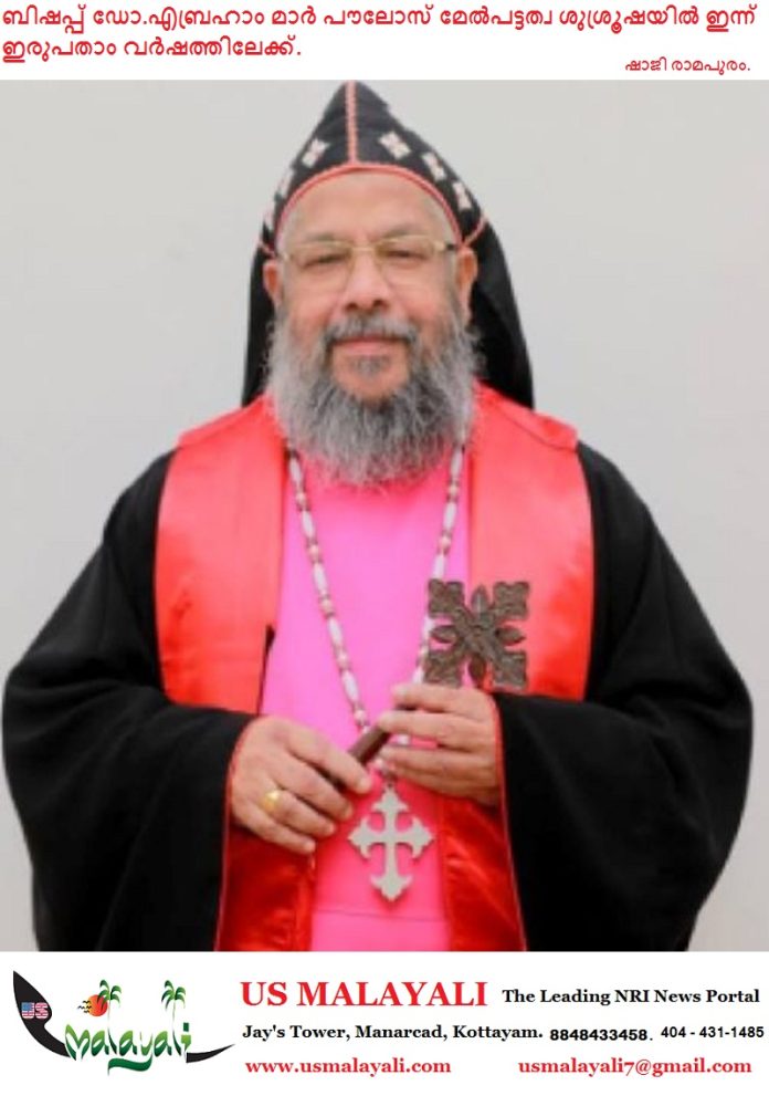 ന്യൂയോർക്ക് : മലങ്കര മാർത്തോമ്മാ സഭയുടെ നോർത്ത് അമേരിക്ക ഭദ്രാസന അധ്യക്ഷൻ ബിഷപ് ഡോ.എബ്രഹാം മാർ പൗലോസ് എപ്പിസ്കോപ്പാ മേൽപട്ടത്വ ശുശ്രുഷയിൽ ഇന്ന് (മെയ് 14) ഇരുപതാം വർഷത്തിലേക്ക് പ്രവേശിക്കുന്നു.