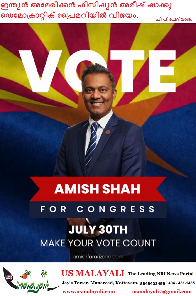 ഫീനിക്സ്(അരിസോണ): അരിസോണയിലെ ആദ്യത്തെ കോൺഗ്രസ്സ് ഡിസ്ട്രിക്റ്റിനെ പ്രതിനിധീകരിക്കാൻ ഡെമോക്രാറ്റിക് പ്രൈമറിയിൽ മുൻ സംസ്ഥാന നിയമസഭാംഗം 47 കാരനായ ഇന്ത്യൻ അമേരിക്കൻ ഭിഷഗ്വരൻ അമീഷ് ഷാ വിജയിച്ചു. ഇതോടെ ഏഴ് തവണ വിജയിച്ച നിലവിലെ റിപ്പബ്ലിക്കൻ ഡേവിഡ് ഷ്വെയ്കെർട്ടുമായി നവംബറിലെ പോരാട്ടത്തിന് കളമൊരുക്കി.