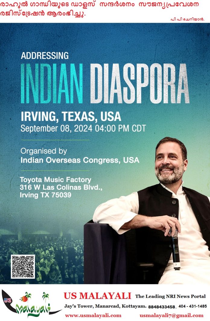 ഇർവിങ് ടൊയോട്ട മ്യൂസിക് ഫാക്ടറിയിൽ സെപ്റ്റംബർ 8 ഞായറാഴ്ച വൈകീട്ട് 4 നു ചേരുന്ന പൊതുസമ്മേളനത്തെ അഭിസംബോധനചെയ്ത് രാഹുൽഗാന്ധി പ്രസംഗിക്കും 6000 തിലധികം പേർക്ക് ഇരിപ്പിട സൗകര്യമുള്ള ടൊയോട്ട മ്യൂസിക് ഫാക്ടറി ഓഡിറ്റോറിയത്തിലേക്കു പ്രശനത്തിനുള്ള രജിസ്ട്രേഷൻ തിരക്ക് ആരംഭിച്ചു പ്രവേശനം സൗജന്യമാണ് എങ്കിലും മുൻകൂട്ടി രജിസ്റ്റർ ചെയ്യുന്നവരുടെ ക്രമം അനുസരിച്ചായിരിക്കും പ്രവേശനം അനുവദിക്കുകയെന്ന് ശ്രീ രാഹുൽ ഗാന്ധി സന്ദർശന സംഘാടക സമിതി ചെയര്മാന് മൊഹിന്ദർ സിംഗ് അറിയിച്ചു.ഡാലസിലെ സന്ദർശനം ചരിത്ര സംഭവമാകുന്നതിനുള്ള പ്രവർത്തനങ്ങൾക്കു എല്ലാവരുടെയും സഹകരണം അദ്ദേഹം അഭ്യർത്ഥിച്ചു .