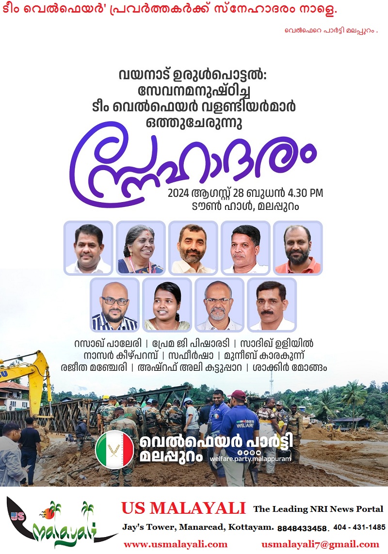 വയനാട്ടിൽ ഉണ്ടായ ദുരന്തത്തിൽ സന്നദ്ധ പ്രവർത്തനത്തിൽ സജീവമായി പങ്കെടുത്ത ‘ടീം വെൽഫെയർ’ അംഗങ്ങളെ വെൽഫെയർ പാർട്ടി മലപ്പുറം ജില്ലാ കമ്മിറ്റി നാളെ (28 ആഗസ്റ്റ് 2025) ആദരിക്കും.