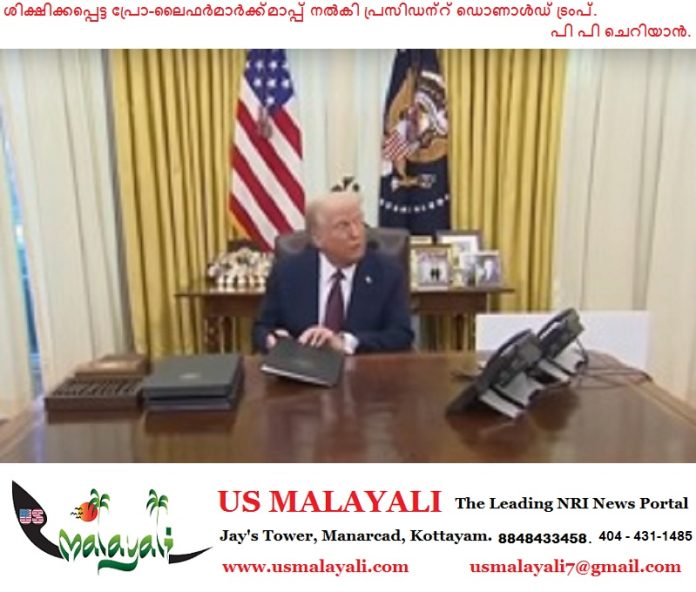 ന്യൂയോർക് :ഗർഭഛിദ്ര ക്ലിനിക്കുകൾക്ക് പുറത്ത് പ്രാർത്ഥിക്കുകയും ആസൂത്രിതമല്ലാത്ത ഗർഭധാരണങ്ങളിൽ സ്ത്രീകളെ ജീവിതം തിരഞ്ഞെടുക്കാൻ പ്രോത്സാഹിപ്പിക്കുകയും ചെയ്തതുൾപ്പെടെയുള്ള പ്രവൃത്തികൾക്ക് ശിക്ഷിക്കപ്പെട്ട 23 പ്രോ-ലൈഫ് പ്രതികൾക്ക് പ്രസിഡന്റ് ഡൊണാൾഡ് ട്രംപ് മാപ്പ് നൽകി.