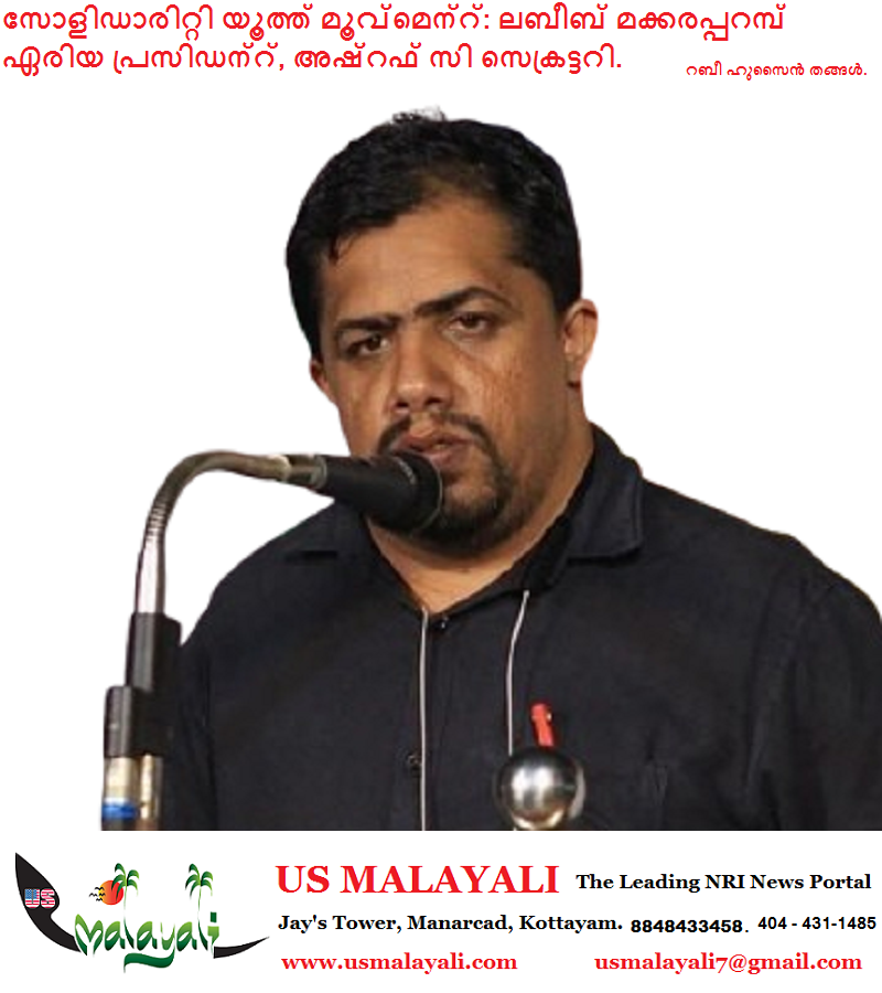 മക്കരപ്പറമ്പ് : സോളിഡാരിറ്റി യൂത്ത് മൂവ്മെന്റ് 2025-26 കാലയളവിലേക്കുള്ള മക്കരപ്പറമ്പ് ഏരിയ പ്രസിഡന്റായി ലബീബ് മക്കരപ്പറമ്പിനെയും സെക്രട്ടറിയായി അഷ്റഫ് സിയെയും തെരെഞ്ഞെടുത്തു. നിയാസ് തങ്ങളെ വൈസ് പ്രസിഡന്റായും റബീ ഹുസൈൻ തങ്ങൾ, ജാബിർ പടിഞ്ഞാറ്റുമുറി, അംജദ് നസീഫ് എന്നിവരെ ജോ. സെക്രട്ടറിമാരായും തെരെഞ്ഞെടുത്തു.