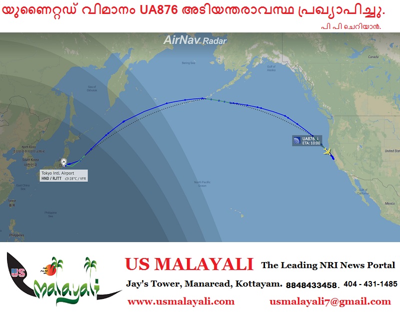 ടോക്കിയോ: ടോക്കിയോയിലെ ഹനേഡ വിമാനത്താവളത്തിൽ നിന്ന് സാൻ ഫ്രാൻസിസ്കോയിലേക്ക് പുറപ്പെട്ട യുണൈറ്റഡ് എയർലൈൻസ് വിമാനം UA876 അടിയന്തരാവസ്ഥ പ്രഖ്യാപിച്ചു. പറന്നുയർന്ന് ഏകദേശം 9 മണിക്കൂറിന് ശേഷമാണ് ബോയിംഗ് 777-200ER (രജിസ്ട്രേഷൻ N229UA) വിമാനം അടിയന്തരാവസ്ഥ പ്രഖ്യാപിച്ചത്.