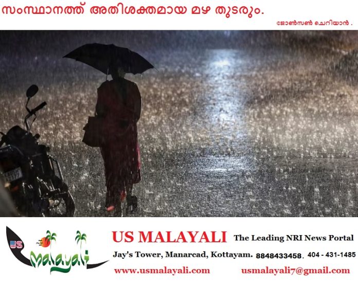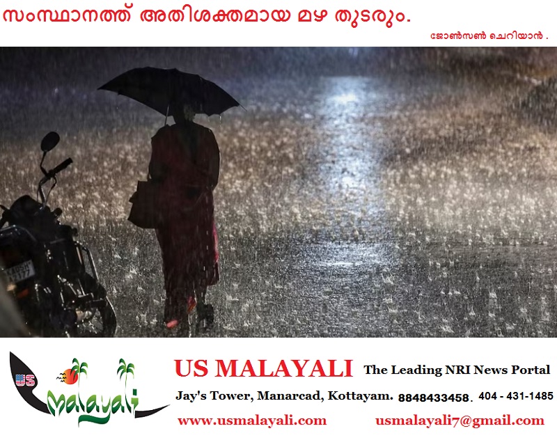സംസ്ഥാനത്ത് അതിശക്തമായ മഴ തുടരാന് സാധ്യതയെന്ന് കേന്ദ്ര കാലാവസ്ഥാ വകുപ്പിന്റെ മുന്നറിയിപ്പ്. തെക്കന് കേരളത്തിലും മധ്യകേരളത്തിലും മലയോര മേഖലകളിലും മഴ കനത്തേക്കും. ഇന്ന് 14 ജില്ലകളിലും മഴ മുന്നറിയിപ്പ് നല്കി. പത്തനംതിട്ട, ആലപ്പുഴ, കോട്ടയം, എറണാകുളം, ഇടുക്കി, തൃശ്ശൂര്, ജില്ലകളില് ഓറഞ്ച് അലേര്ട്ട് പ്രഖ്യാപിച്ചു.