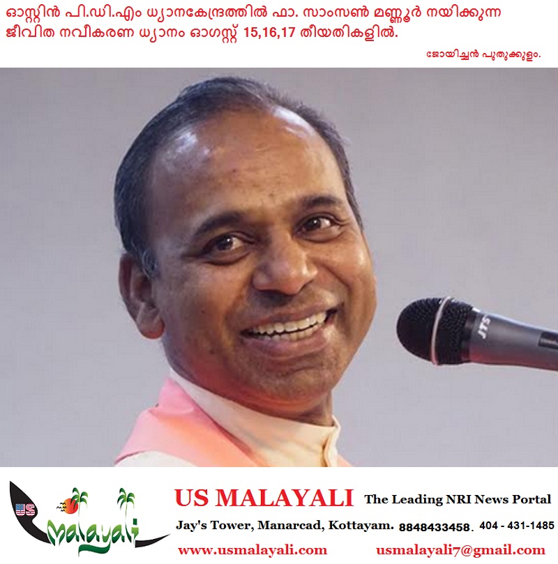 ഓസ്റ്റിന് (ടെക്സാസ്): ബഹുമാനപ്പെട്ട സേവ്യര് ഖാന് വട്ടായില് നേതൃത്വം കൊടുക്കുന്ന അമേരിക്കയിലെ ടെക്സസ് സംസ്ഥാനത്തുള്ള ഓസ്റ്റിനില് പ്രവര്ത്തിക്കുന്ന പി.ഡി.എം. ധ്യാന കേന്ദ്രത്തില് എല്ലാ മാസവും വിവിധങ്ങളായ ധ്യാനങ്ങള് വിജയകരമായി നടന്നുവരുന്നു.
