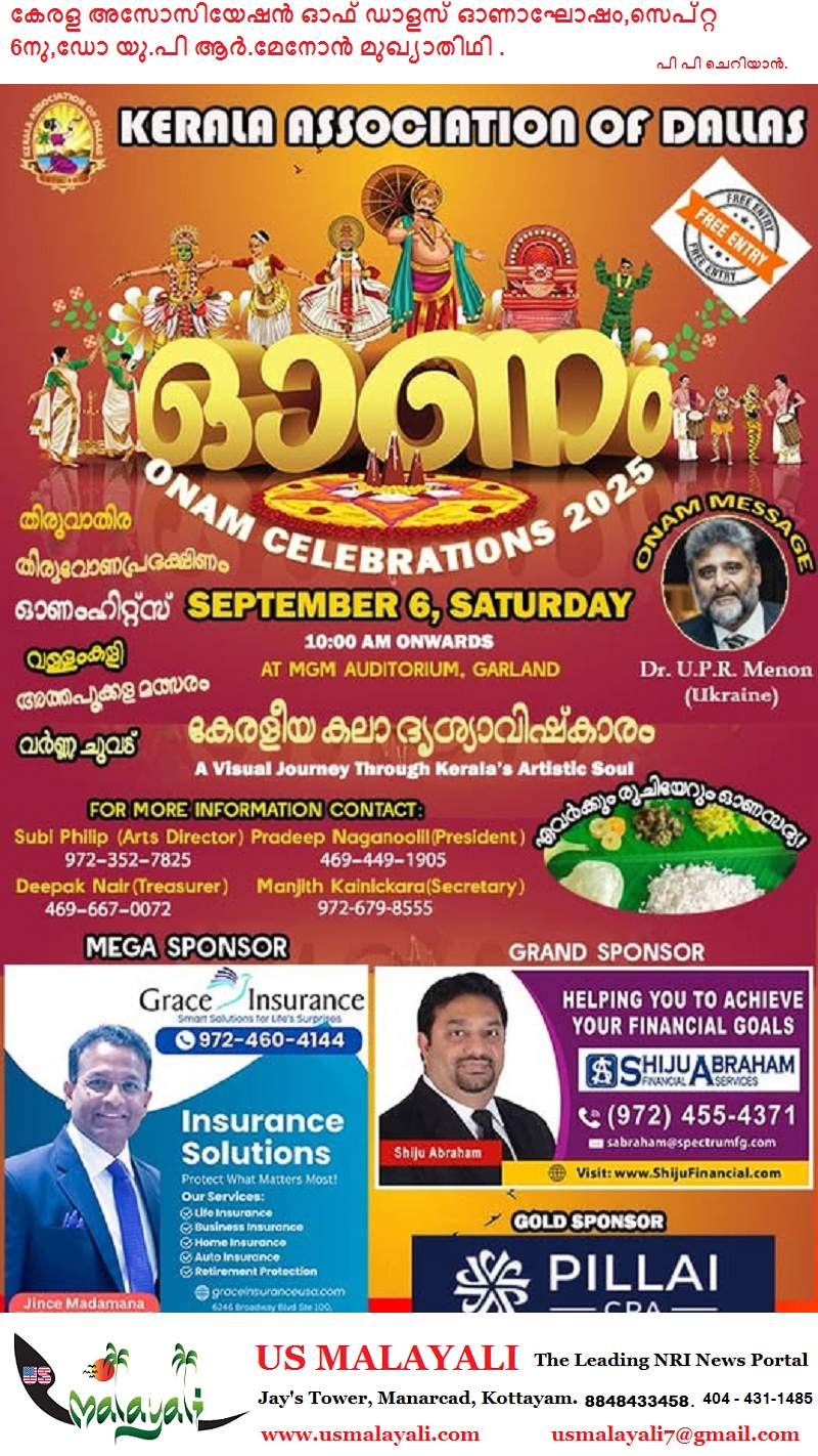 ഹ്രസ്വ സന്ദർശനത്തിനായി അമേരിക്കയിൽ എത്തിച്ചേർന്ന ഫാർമസ്യൂട്ടിക്കൽ മാനുഫാക്ചറേഴ്സ് അസോസിയേഷൻ (IPMA) ഉക്രെയ്ൻ പ്രസിഡന്റായ ഡോ. യു.പി ആർ. മേനോൻ ഓണസന്ദേശം നൽകും