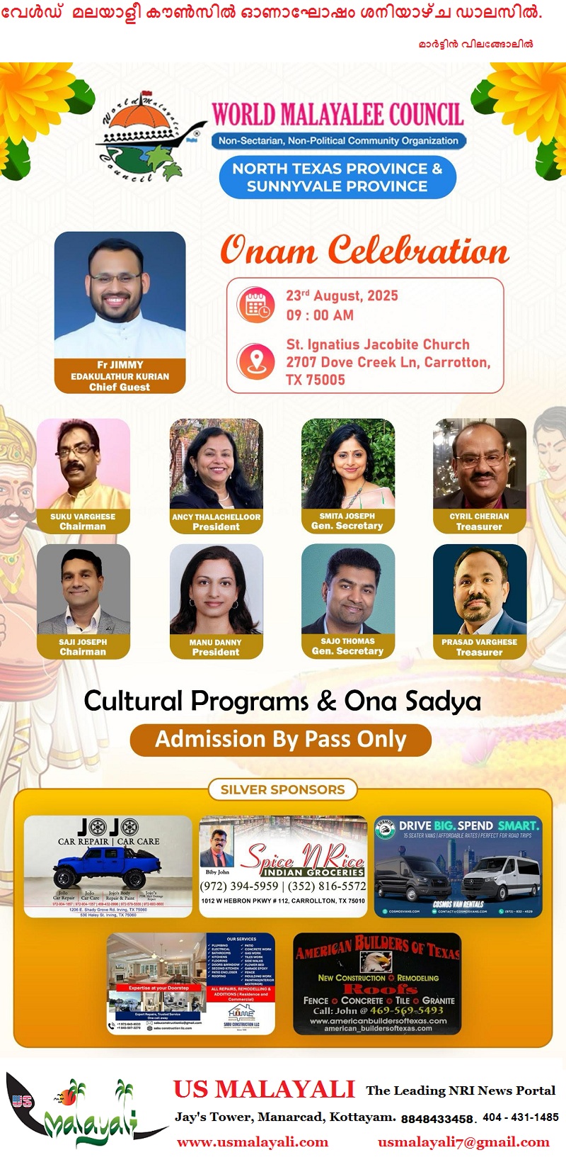 ഫാ. ജിമ്മി എടക്കളത്തൂർ കുര്യൻ (സെന്റ്. മറിയം ത്രേസ്യാ മിഷൻ നോർത്ത് ഡാളസ് ഡയറ്കടർ, സെന്റ്. അൽഫോൻസാ കൊപ്പേൽ അസി. വികാരി) മുഖ്യ അതിഥിയായി ഓണസന്ദേശം നൽകും.