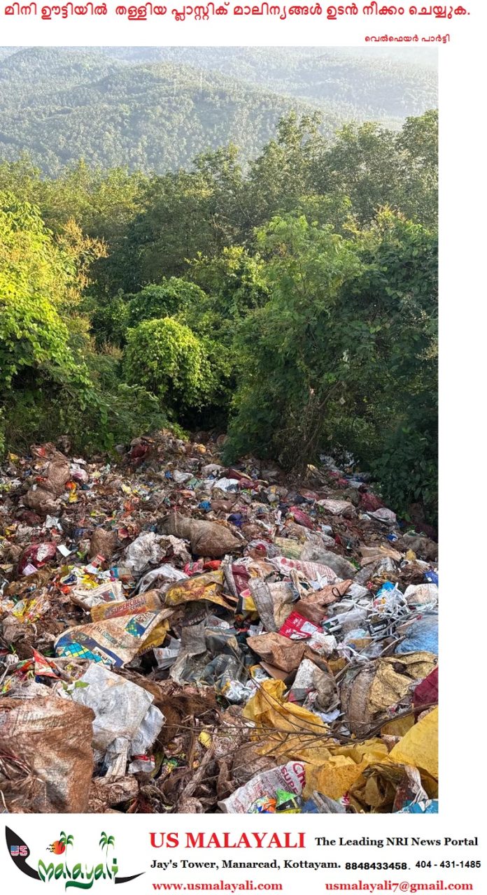 മൊറയൂർ: ജില്ലക്ക് പുറത്ത് നിന്നുമുള്ള പ്ലാസ്റ്റിക് മാലിന്യവും മറ്റ് അജൈവ മാലിന്യങ്ങളും പ്രകൃതിരമണീയമായ മിനിഊട്ടിയിൽ തള്ളിയ നടപടിയിൽ ഉടനടി പരിഹാരം വേണമെന്ന് വെൽഫയർ പാർട്ടി ജില്ല സെക്രട്ടറി ശാക്കിർ മോങ്ങം ആവശ്യപ്പെട്ടു. മിനി ഊട്ടിയുടെ വിവിധ ഭാഗങ്ങളിൽ ധാരാളം മാലിന്യങ്ങളാണ് തളളിയിരിക്കുന്നത്. മഴ പെയ്താൽ ഇവ കൃഷിയിടങ്ങളിലും ജനവാസ കേന്ദ്രങ്ങളും എത്തിച്ചേർന്ന് വലിയ പാരിസ്ഥിതിക പ്രയാസങ്ങൾ ഉണ്ടാക്കും. ഇവ ശാസ്ത്രീയമായി നീക്കം ചെയ്യാൻ സർക്കാർ, പഞ്ചായത്ത് അധികൃതർ സത്വര നടപടികൾ സ്വീകരിക്കുകയും ഇത്തരം പ്രവൃത്തികൾ ആവർത്തിക്കാതിരിക്കാൻ സമൂഹ്യദ്രോഹികളെ നിയമത്തിന് മുന്നിൽ കൊണ്ടുവരികയും മാതൃകാപരമായി ശിക്ഷിക്കുകയും ചെയ്യണമെന്ന് അദ്ദേഹം ആവശ്യപ്പെട്ടു.