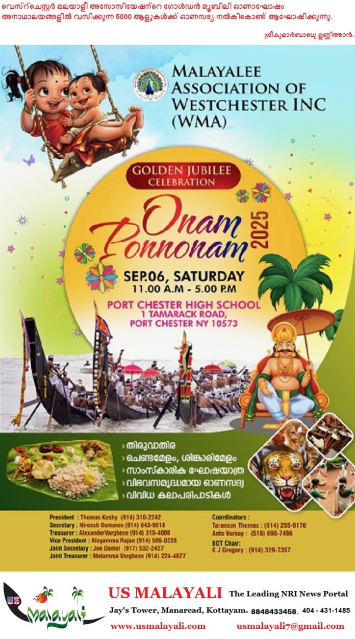 ന്യൂ യോർക്ക് :അമേരിക്കയിലെ ഏറ്റവും വലിയ ഓണഘോഷങ്ങളിൽ ഒന്നായ വെസ്റ്റ് ചെസ്റ്റര് മലയാളി അസോസിയേഷന്റെ ഈ വർഷത്തെ ഓണഘോഷം 2025 സെപ്റ്റംബർ 6 ന് ശനിയാഴ്ച 11 മണി മുതല് 6.00 മണി വരെ പോർചെസ്റ്റർ ഹൈസ്കൂൾ ആഡിറ്റോറിയത്തിൽ (1 Tamarack Road , Port Chester,NY 10573) വെച്ച് വിപുലമായ പരിപാടികളോട് നടത്തുന്നതാണ്.