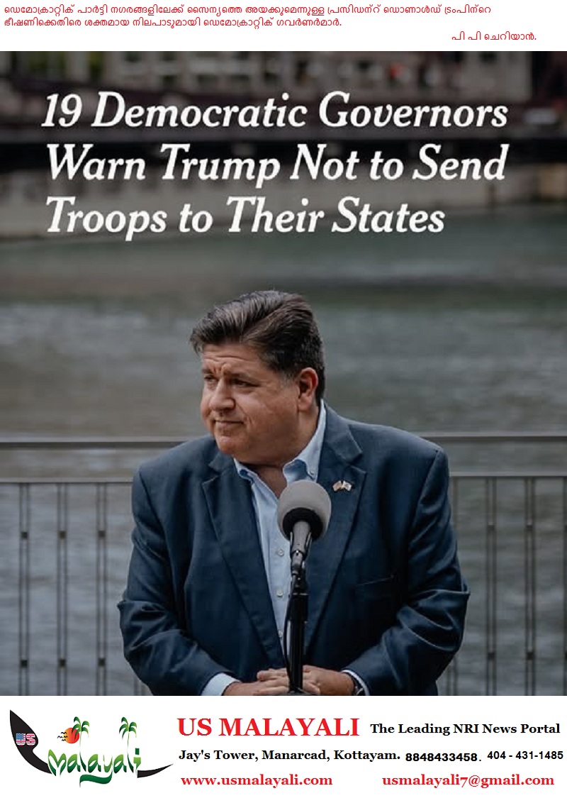 വാഷിംഗ്ടൺ: ഡെമോക്രാറ്റിക് പാർട്ടി ഭരിക്കുന്ന നഗരങ്ങളിലേക്ക് സൈന്യത്തെ അയക്കുമെന്നുള്ള പ്രസിഡന്റ് ഡൊണാൾഡ് ട്രംപിന്റെ ഭീഷണിക്കെതിരെ ശക്തമായ നിലപാടുമായി ഡെമോക്രാറ്റിക് ഗവർണർമാർ. ഡെമോക്രാറ്റിക് ഗവർണേഴ്സ് അസോസിയേഷൻ സംഘടിപ്പിച്ച ഒരു കത്തിൽ ഒപ്പിട്ടുകൊണ്ട് മിക്ക ഡെമോക്രാറ്റിക് ഗവർണർമാരും ട്രംപിന്റെ നീക്കത്തെ “അധികാര ദുർവിനിയോഗം” എന്ന് വിശേഷിപ്പിച്ചു.