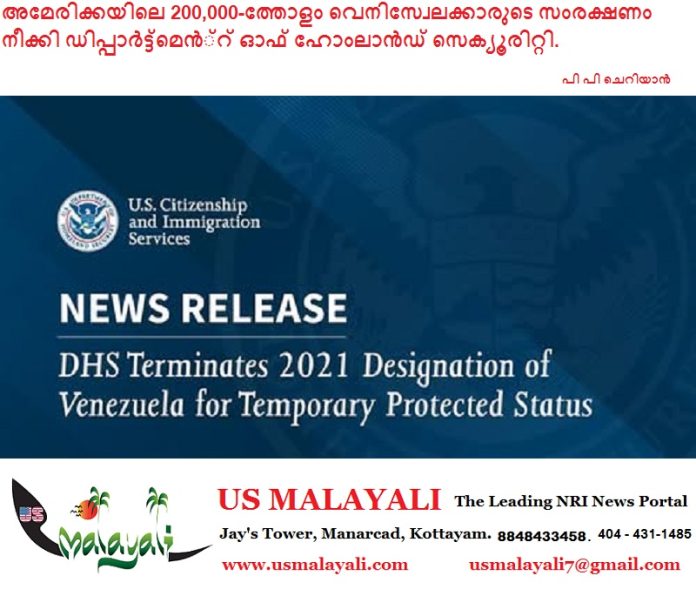 വാഷിങ്ടൺ:വെനിസ്വേലക്കാരുടെ “താൽക്കാലിക സംരക്ഷണ പദവി” അവസാനിപ്പിക്കുമെന്ന് ഹോംലാൻഡ് സെക്യൂരിറ്റി വകുപ്പ് ബുധനാഴ്ച പ്രഖ്യാപിച്ചു.ഇതോടെ 200,000-ത്തിലധികം വെനിസ്വേലക്കാർക്ക് അമേരിക്കയിൽ താമസിക്കാനുള്ള നിയമപരമായ അവകാശം നഷ്ടമാകും.
