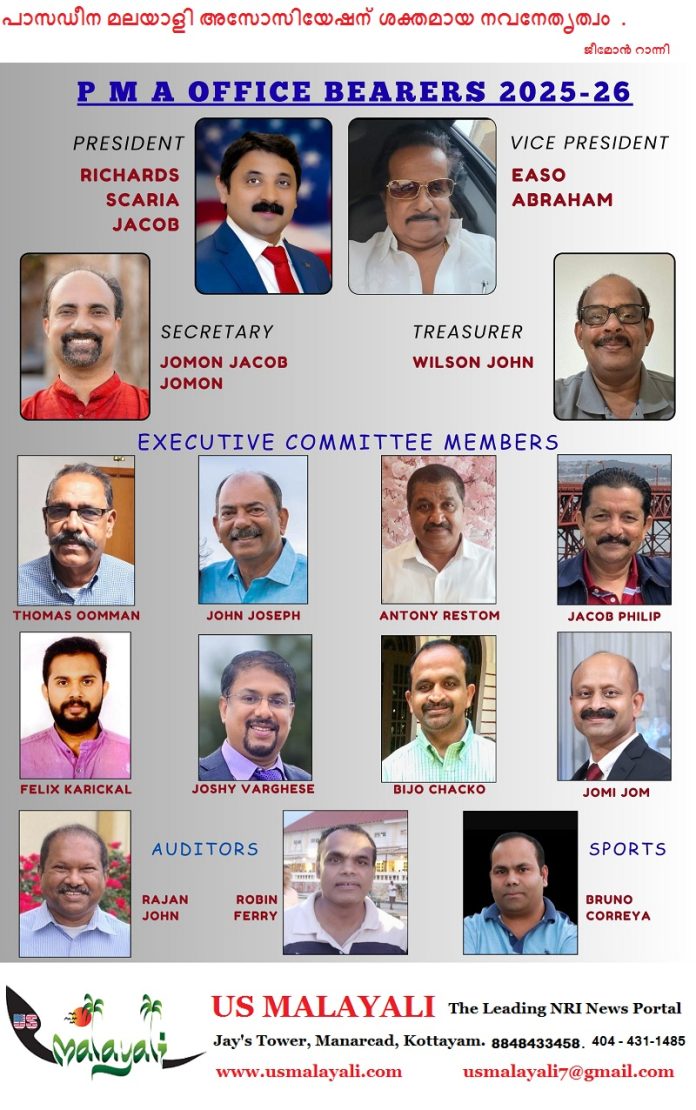 ഹൂസ്റ്റൺ : 1980കളിൽ ആരംഭിച്ച് നാളിതുവരെ 350ൽ പരം സാധു കുടുംബങ്ങൾക്ക് ചികിത്സാ സഹായം നൽകി മുന്നേറുന്ന ഹൂസ്റ്റണിലെ പ്രമുഖ മലയാളി കൂട്ടായ്മകളിലൊന്നായ പാസഡീന മലയാളി അസോസിയേഷൻ (PMA) ഇക്കഴിഞ്ഞ ദിവസം നടത്തപ്പെട്ട പിക്നിക്കിനോനുബന്ധിച്ച് 2025-26 പ്രവർത്തന വർഷത്തേക്കുള്ള ഭാരവാഹികളെ തിരഞ്ഞെടുത്തു.