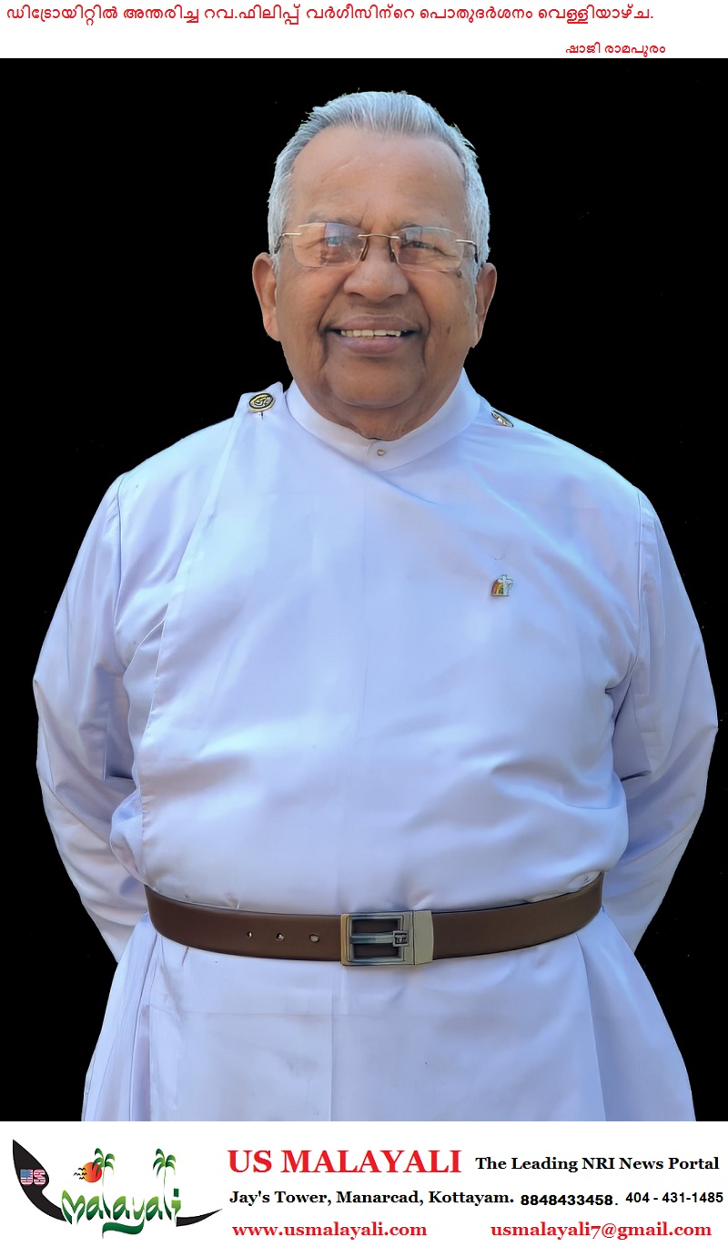 ന്യൂയോർക്ക്: ഡിട്രോയിറ്റിൽ അന്തരിച്ച മാർത്തോമ്മ സഭയിലെ സീനിയർ വൈദീകനും, പ്രമുഖ കൺവെൻഷൻ പ്രഭാഷകനും ആയിരുന്ന വെണ്മണി വാതല്ലൂർ കുടുംബാംഗം റവ.ഫിലിപ്പ് വർഗീസിന്റെ (87) പൊതുദർശനം സെപ്റ്റംബർ 12 വെള്ളിയാഴ്ച വൈകിട്ട് 4.30 മുതൽ 9 മണി വരെ ഡിട്രോയിറ്റ് മാർത്തോമ്മ ദേവാലയത്തിൽ (24518 Lahser Rd, Southfield, MI 48033) വെച്ച് നടത്തപ്പെടും.