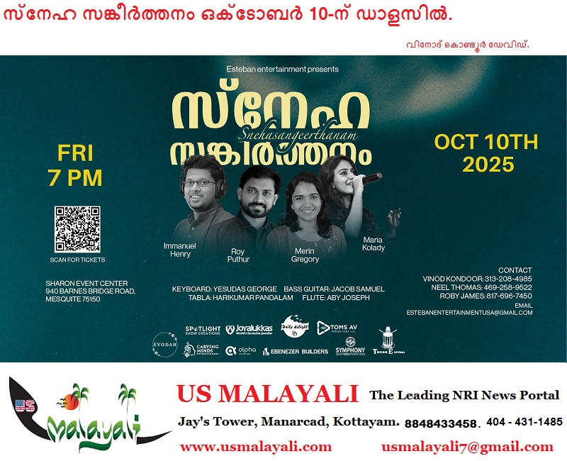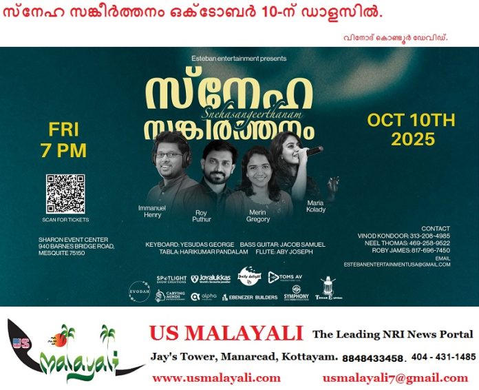 ഡാളസ്/മെസ്കിറ്റ്: സ്വർഗ്ഗീയ സംഗീതത്തിൻ്റെ മാസ്മരികത ഉയർത്തി കൊണ്ട് ക്രിസ്തീയ ഗായകനും ഐഡിയ സ്റ്റാർ സിംഗർ താരവുമായ ഇമ്മാനുവേൽ ഹെൻറിയും സംഘവും ഡാളസ് പട്ടണത്തിൽ ഈ സെപ്റ്റംബറിൽ സംഗീത സന്ധ്യയുമായി എത്തുകയാണ്. ഇമ്മാനുവേൽ ഹെൻറിയോടൊപ്പം, പ്രശസ്ത ഗായകരായ റോയ് പുത്തൂർ, മെറിൻ ഗ്രിഗറി, മരിയ കോലടി എന്നിവരും പങ്കെടുക്കുന്നുണ്ട്. അമേരിക്കൻ ഐക്യനാടുകളിലെ പര്യടനത്തിനെത്തുന്നതിൻ്റെ ഭാഗമായാണ് സ്നേഹസങ്കീർത്തനം ടീം, പ്രമുഖ സിറ്റിയായ ഡാളസ്സിലും പരിപാടി സംഘടിപ്പിക്കുന്നത്.