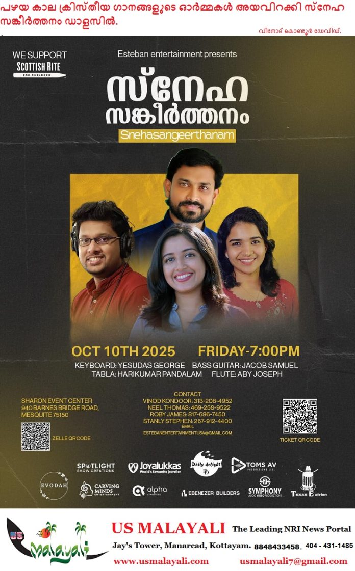 മെസ്കീറ്റ്/ഡാളസ്: “വെളിവു നിറഞ്ഞൊരീശോ നിൻ വെളിവായ് കാണുന്നു…” മലങ്കര ഓർത്തഡോക്സ് സുറിയാനി സഭയുടെ അതി മനോഹര കുർബ്ബാന ഗാനങ്ങൾ, കോട്ടയം ഉൾപ്പെടെയുള്ള മദ്ധ്യ തിരുവതാംകൂർ ഭാഗത്തുള്ള ഏതൊരു മലയാളിക്കും ഒരു പക്ഷെ കേട്ടു പരിചയമെങ്കിലും ഉണ്ടാകും. മറ്റു പഴയ കാല ക്രിസ്തീയ ഗാനങ്ങളായ മൽപ്രീയനേ എന്നേശു നായകനേ, പ്രാർത്ഥന കേൾക്കണമേ കർത്താവേ, തുടങ്ങിയ ഗാനങ്ങൾ ഒരു കഴിഞ്ഞ കാലഘട്ടത്തിലേക്ക് ഊളിയിട്ടു കൊണ്ടു പോകുമെന്നതിൽ അശേഷം സംശയമില്ല. ഈ ഗാനങ്ങളൊക്കെ ഉൾപ്പെടുത്തി, പ്രശസ്ത സംഗീതജ്ഞനും, സ്വർഗ്ഗീയ ഗാനാലാപകനുമായ റോയ് പുത്തൂരിൻ്റെ സ്വതസിദ്ധ ശൈലിയിൽ ക്രിസ്തീയ സംഗീത സന്ധ്യയുമായി എത്തുകയാണ് , ഡാളസ്സിനടുത്ത് മെസ്കിറ്റ് സിറ്റിയിൽ. ഒപ്പം പ്രശസ്ത ഐഡിയ സ്റ്റാർ സിംഗർ താരം ഇമ്മാനുവേൽ ഹെൻറി, ഒപ്പം മരിയ കോലടി, മെറിൻ ജോർജ് തുടങ്ങിയ അനുഗ്രഹീത ഗായകസംഘം ലൈവായി അവതരിപ്പിക്കുന്ന ഈ ക്രിസ്തീയ ഗാനസന്ധ്യ, കാണികൾക്ക് എന്നും ഗ്രഹാതുരത്വം പകരുന്നതായിരിക്കും.