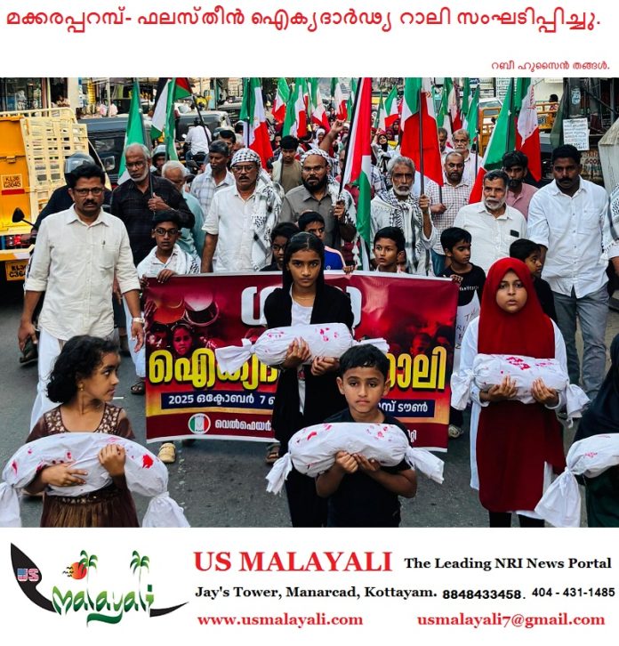 മക്കരപ്പറമ്പ് : പിറന്ന സ്വന്തം മണ്ണിൽ ജീവിക്കാനുള്ള അവകാശത്തിനു വേണ്ടി പോരാടിക്കൊണ്ടിരിക്കുന്ന ഫലസ്തീൻ ജനതയ്ക്ക് ഐക്യദാർഢ്യമറിയിച്ചും സ്ത്രീകളെയും കുട്ടികളെയും നിഷ്ഠൂരമായി കൊല ചെയ്യുന്ന ഇസ്രായേൽ കാപാലികർക്കെതിരെ പ്രതിഷേധമിരമ്പിയും വെൽഫെയർ പാർട്ടി മക്കരപ്പറമ്പ് പഞ്ചായത്ത് കമ്മറ്റിയുടെ നേതൃത്വത്തിൽ മക്കരപ്പറമ്പ് ടൗണിൽ ഫലസ്തീൻ ഐക്യദാർഢ്യ റാലി സംഘടിപ്പിച്ചു.