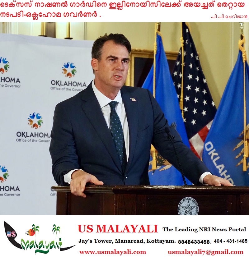 ഒക്ലഹോമ : ടെക്സാസ് ഗവര്ണര് ഗ്രെഗ് അബോട്ട് ഇല്ലിനോയിസിലേക്ക് നാഷണല് ഗാര്ഡ് സൈനികരെ അയച്ചതിനെതിരെ ഒക്ലഹോമ ഗവര്ണറും റിപ്പബ്ലിക്കനും ആയ കെവിന് സ്റ്റിറ്റ് പ്രതിഷേധം രേഖപ്പെടുത്തി. ഫെഡറലിസത്തിന്റെയും സംസ്ഥാനങ്ങളുടെ അവകാശങ്ങളുടെയും ഭാഗമായി സ്റ്റിറ്റ് ഈ നീക്കത്തിനെതിരെ നിലപാടെടുത്തതായാണ് റിപ്പോര്ട്ട് ചെയ്തിരിക്കുന്നത്.