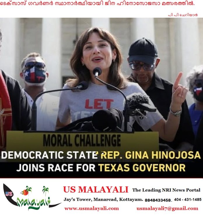 ടെക്സാസ്:ടെക്സാസ് സംസ്ഥാനത്തെ ഡെമോക്രാറ്റിക് പ്രതിനിധിയും ആസ്റ്റിൻ നഗരത്തെ പ്രതിനിധീകരിക്കുന്ന ജിന ഹിനോസോജസാ 2026ലെ ഗവർണർ തെരഞ്ഞെടുപ്പിൽ മത്സരിക്കുമെന്ന് പ്രഖ്യാപിച്ചു. അഞ്ചു തവണ നിയമസഭയിലെത്തിയ ഹിനോസോജസാ വിദ്യാഭ്യാസ മേഖലയിലെ വിഷയങ്ങളിൽ ഗവർണർ ഗ്രെഗ് അബറ്റിന്റെ ശക്തമായ വിമർശകയായിട്ടുണ്ട്, പ്രത്യേകിച്ച് സ്കൂൾ വൗച്ചർ പദ്ധതികളിൽ.