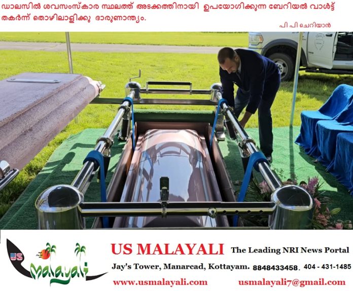 ഡാലസ് :ടെക്സാസിലെ ഡാലസിന് സമീപം റെസ്റ്റ്ലാൻഡ് ശ്മശാനത്തില് അടക്കത്തിനായി ഉപയോഗിക്കുന്ന ബേറിയല് വാള്ട്ട് തകര്ന്ന് ഒരു തൊഴിലാളി മരിച്ചു. സംഭവമുണ്ടായത് ഒക്ടോബര് 20-നാണ്.