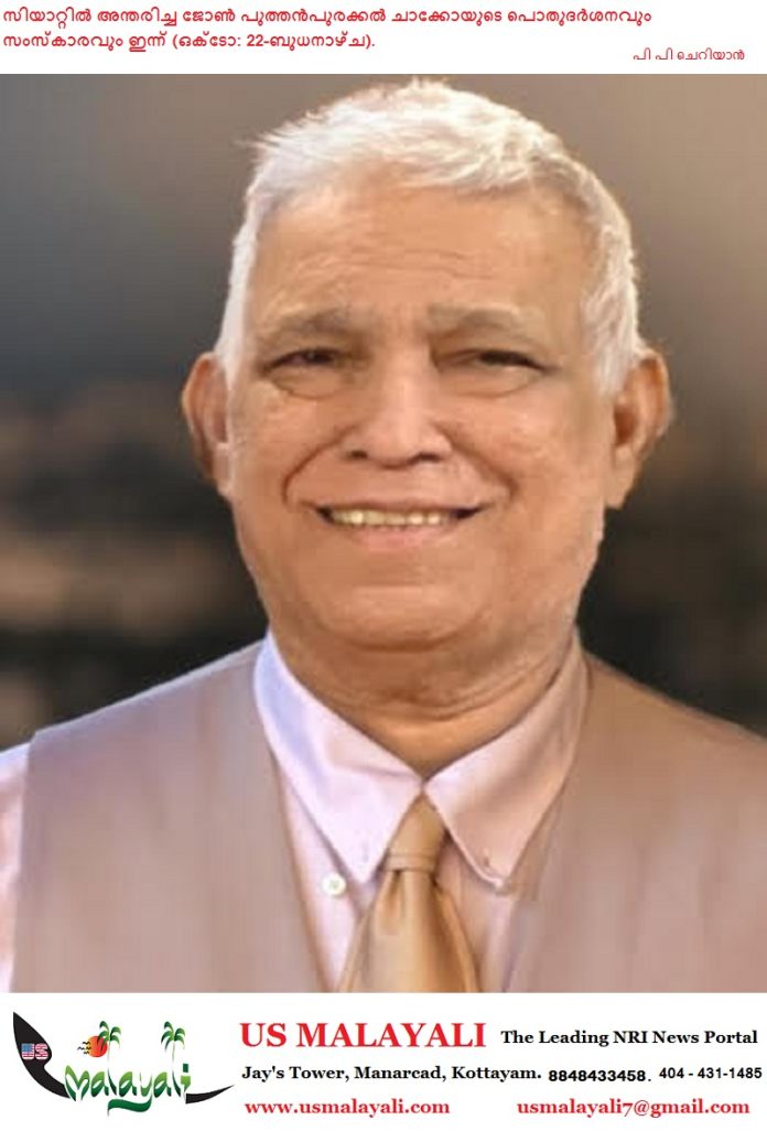 ലിൻവുഡ്, വാഷിംഗ്ടൺ: അന്തരിച്ച ജോൺ പുത്തൻപുരക്കൽ ചാക്കോയുടെ അന്ത്യകർമ്മങ്ങളും അനുസ്മരണ ശുശ്രൂഷകളും 2025 ഒക്ടോബർ 22, ബുധനാഴ്ച ലിൻവുഡിലെ പർഡി & വാൾട്ടേഴ്സ് അറ്റ് ഫ്ലോറൽ ഹിൽസിൽ വെച്ച് നടക്കും.PURDY & WALTERS AT FLORAL HILLS 409 Filbert Road, Lynnwood, WA 980364934)
