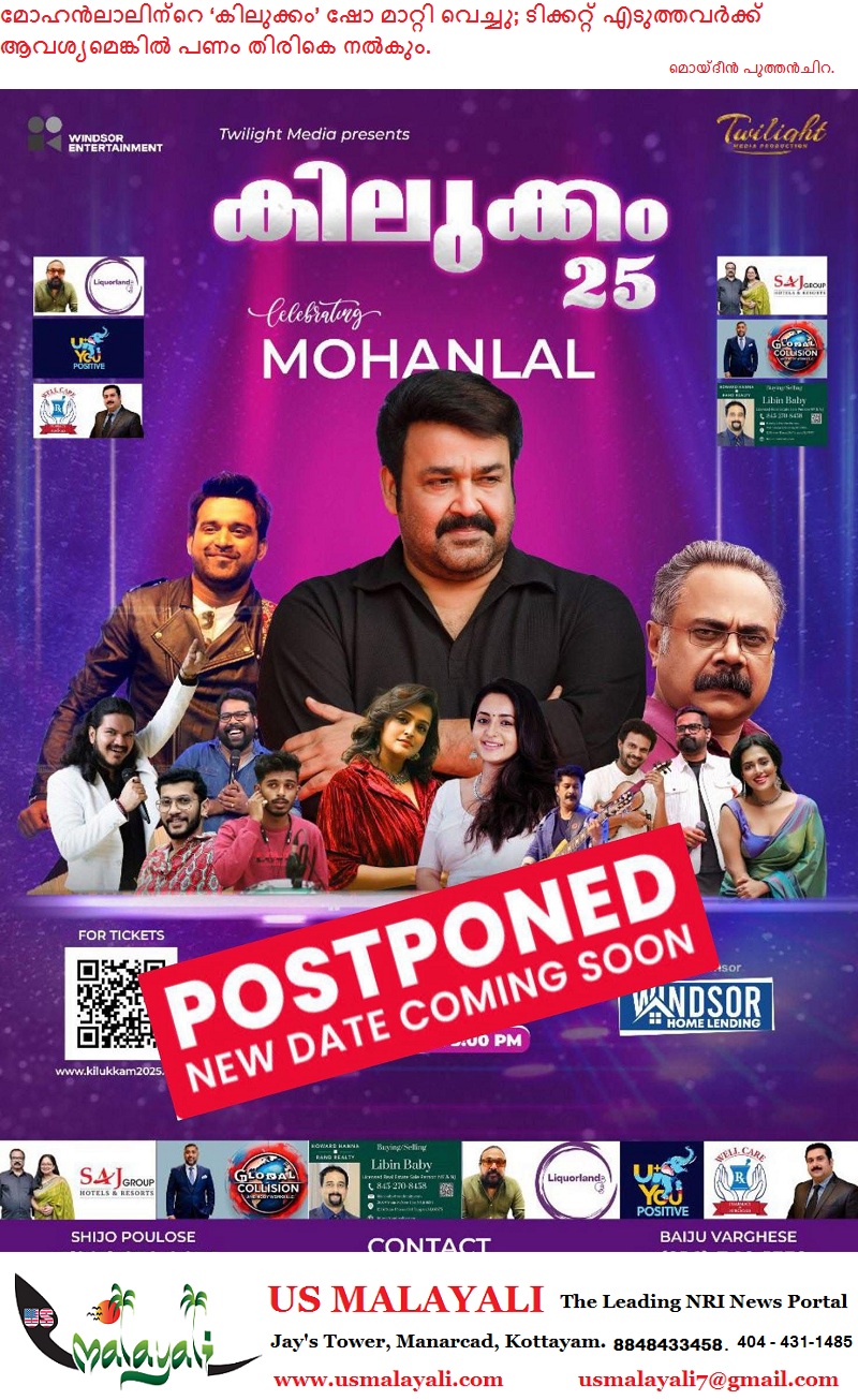 ന്യൂജെഴ്സി: അപ്രതീക്ഷിതമായുണ്ടായ ചില സാങ്കേതിക തടസ്സങ്ങള് മൂലം, ഈ വര്ഷം സെപ്തംബര് 1-ന് നടത്താനിരുന്ന മോഹൽലാൽ ഷോ ‘കിലുക്കം 2025’ മാറ്റി വെയ്ക്കാന് സംഘാടകര് നിര്ബ്ബന്ധിതരാകുകയും, പ്രസ്തുത ഷോ 2026 ആദ്യ പാദത്തിലേക്ക് (First Quarter) മാറ്റി വെച്ചതായും പ്രോഗ്രാമിന്റെ നാഷണൽ സ്പോൺസറായ വിൻഡ്സർ എന്റർടൈൻമെന്റ് അറിയിച്ചു. 2025-ൽ തന്നെ ഷോയുടെ ആതിഥേയത്വം വഹിക്കാൻ പ്രമോട്ടർമാർ ആത്മാർത്ഥമായി ആഗ്രഹിച്ചിരുന്നെങ്കിലും, അവരുടെ നിയന്ത്രണത്തിന് അതീതമായ ചില ഘടകങ്ങൾ കാരണം ഷെഡ്യൂൾ പുനഃക്രമീകരിക്കേണ്ടി വന്നു. ഈ മാറ്റം ഉണ്ടാക്കിയ അസൗകര്യത്തിൽ പ്രമോട്ടർമാർ ഖേദിക്കുന്നു, ആത്മാർത്ഥമായി ക്ഷമ ചോദിക്കുന്നു!!