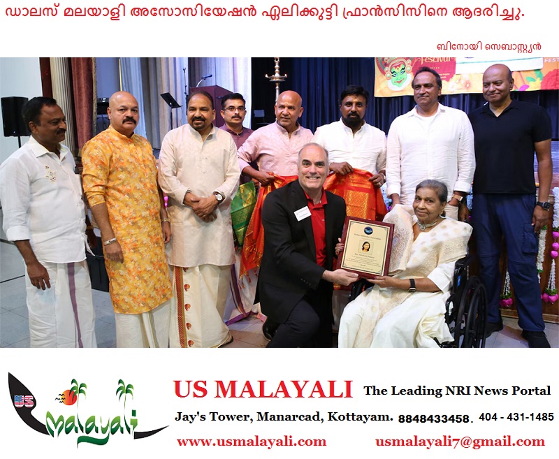 ഡാലസ്: ടെക്സസിലെ പ്രമുഖ സാംസ്കാരിക പ്രവർത്തകയും നോർത്ത് ടെക്സസ് ഇൻഡോ അമേരിക്കൻ നഴ്സസ് അസോസിയേഷൻ സ്ഥാപകനേതാവും ജീവകാരുണ്യ പ്രവർത്തകയുമായ ഏലിക്കുട്ടി ഫ്രാൻസിസിനെ കരോൾട്ടൻ സിറ്റി മേയർ സ്റ്റീവ് ബാബിക് പൊന്നാടയണിച്ച് ഫലകം നൽകിയാദരിച്ചു.