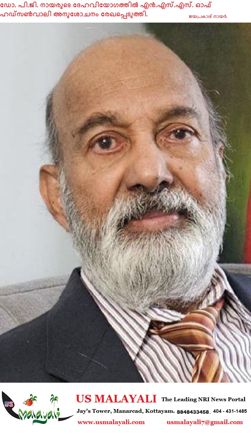 ന്യൂയോര്ക്ക്: നായർ ബനവലന്റ് അസോസിയേഷന്റെ പ്രാരംഭ പ്രവർത്തകരിൽ ഒരാളും, മുൻ പ്രസിഡന്റും, എൻ.എസ്.എസ്. ഓഫ് ഹഡ്സൺവാലിയുടെ സഹയാത്രികനും ഉപദേഷ്ടാവും രക്ഷാധികാരിയുമായിരുന്ന ഡോ. പി.ജി. നായരുടെ ദേഹവിയോഗത്തില് എൻ.എസ്.എസ്. ഓഫ് ഹഡ്സൺവാലി അനുശോചനം രേഖപ്പെടുത്തി. ഒരു തികഞ്ഞ ജീവകാരുണ്യ പ്രവർത്തകൻ, സാമൂഹ്യ പരിഷ്കർത്താവ് എന്നീ നിലകളിൽ സമാരാദ്ധ്യനുമായിരുന്നു ഡോ. പി.ജി. നായര് എന്ന് അനുശോചന സന്ദേശത്തില് പറഞ്ഞു.