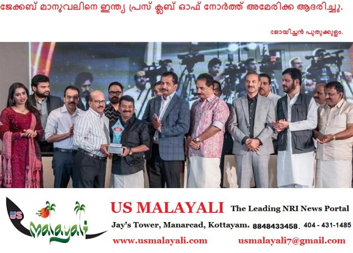 എഡിസൺ, ന്യു ജേഴ്സി: ദൃശ്യമാധ്യമ രംഗത്തെ മികച്ച പ്രവർത്തനങ്ങൾക്ക് ജേക്കബ് മാനുവലിനെ ഇന്ത്യ പ്രസ് ക്ലബ് ഓഫ് നോർത്ത് അമേരിക്കയുടെ അന്താരാഷ്ട്ര കോൺഫറൻസിൽ ആദരിച്ചു. എഡിസൺ ഷെറാട്ടണിൽ നടന്ന സമ്മേളനത്തിൽ റാന്നി എം.എൽ.എ പ്രമോദ് നാരായൺ അവാർഡ് സമ്മാനിച്ചു. എം.പി.മാരായ എം.കെ. പ്രേമചന്ദ്രൻ, വി.കെ. ശ്രീകണ്ഠൻ, ഇന്ത്യ പ്രസ് ക്ലബ് പ്രസിഡന്റ് സുനിൽ ട്രൈസ്റ്റാർ, സെക്രട്ടറി ഷിജോ പൗലോസ്, അഡ്വൈസറി ബോർഡ് ചെയർ സുനിൽ തൈമറ്റം, മാധ്യമ പ്രവർത്തക സുജയ് പാർവതി എന്നിവരുടെ സാന്നിധ്യത്തിലായിരുന്നു അവാർഡ് സമ്മാനിച്ചത്.