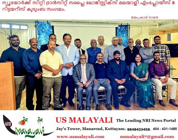 ന്യൂയോര്ക്ക്: ന്യൂയോർക്ക് സിറ്റി ട്രാൻസിറ്റിലെ സപ്ലൈ ലൊജിസ്റ്റിക്സ് വിഭാഗത്തിൽ ജോലി ചെയ്യുന്നവരുടെയും, ജോലിയില് നിന്ന് വിരമിച്ചവരുടേയും കുടുംബസംഗമം 2026 ഒക്ടോബർ 25 ശനിയാഴ്ച വൈകീട്ട് 4 മണിക്ക് ഹെംസ്റ്റെഡിലെ സെന്റ് സ്റ്റീഫൻസ് ക്നാനായ കാത്തലിക് ഫൊറേൻ ചർച്ച് (384 Clinton Street, Hempstead) ഓഡിറ്റോററിയത്തിൽ വച്ച് നടത്തി.