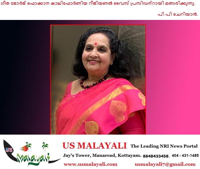 കാലിഫോര്ണിയയിലെ നിരവധി സാമൂഹിക സന്നദ്ധ സംഘടനകളുടെ നേതൃത്വം വഹിച്ചുവരുന്ന ഗീത ജോര്ജ് പ്രസിഡന്റ് സ്ഥാനത്തേക്ക് മത്സരിക്കുന്ന ലീല മാരേട്ട് നേതൃത്വം നല്കുന്ന ടീമില് മത്സരിക്കുന്നു.
