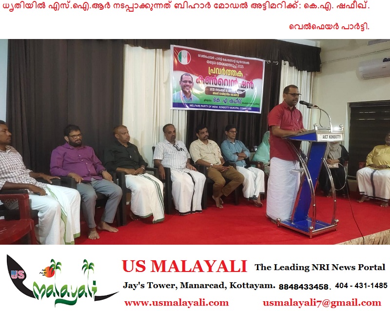 കൊണ്ടോട്ടി: തീവ്രസമ്മർദ്ദം ചെലുത്തിയും ആശയക്കുഴപ്പങ്ങൾ പരിഹരിക്കാതെയും കേരളത്തിൽ ധൃതിയിൽ എസ്.ഐ.ആർ നടപ്പാക്കുന്നത് ബീഹാർ മോഡൽ അട്ടിമറിക്കാണെന്ന് വെൽഫെയർ പാർട്ടി സംസ്ഥാന വൈസ് പ്രസിഡന്റ് കെ.എ ഷഫീഖ് ആരോപിച്ചു. മർകസ് ഓഡിറ്റോറിയത്തിൽ വെൽഫെയർ പാർട്ടി കൊണ്ടോട്ടി മുനിസിപ്പൽ പ്രവർത്തക കൺവെൻഷൻ ഉദ്ഘാടനം ചെയ്യുകയായിരുന്നു അദ്ദേഹം. ജനാധിപത്യത്തെ ദുർബലമാക്കാനുള്ള കേന്ദ്ര ഭരണകൂടത്തിന്റെ ശ്രമങ്ങൾക്കെതിരെ അതീവ ജാഗ്രതയോടെ ജനകീയ ചെറുത്തുനിൽപ് ഉയർത്തിക്കൊണ്ടുവരണമെന്ന് അദ്ദേഹം ആവശ്യപ്പെട്ടു.