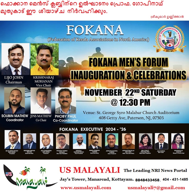 ന്യൂ യോർക്ക് : ഫൊക്കാന മെൻസ് ക്ലബ്ബിന്റെ ഉൽഘാടനം പ്രമുഖ മജീഷ്യനും, സാമുഖ്യ പ്രവർത്തകനുമായ പ്രൊഫ . ഗോപിനാഥ് മുതുകാട് നവംബർ 22 ,ശനിയാഴ്ച ഉച്ചക്ക് 12 മണി മുതൽ സെന്റ്. ജോർജ് സിറോ മലബാർ ചർച്ച് ഓഡിറ്റോറിയത്തിൽ ( 408 Getty Avenue, Paterson, NJ 07503) ഉൽഘാടനം ചെയ്യുന്നതാണ് എന്ന് പ്രസിഡന്റ് സജിമോൻ ആന്റണി അറിയിച്ചു.