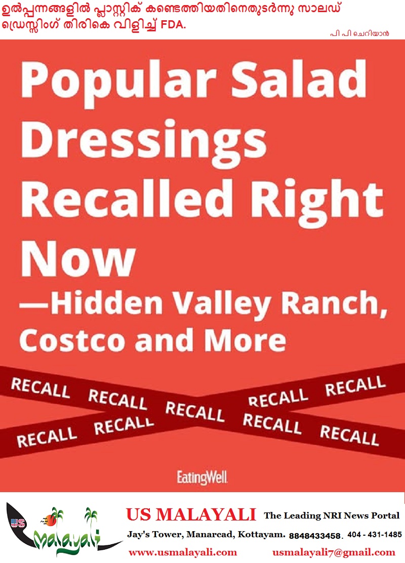 ന്യൂയോർക് :27 സംസ്ഥാനങ്ങളിൽ വിതരണം ചെയ്ത ആയിരക്കണക്കിന് ഗാലൻ സാലഡ് ഡ്രെസ്സിംഗുകളും മറ്റ് ഉൽപ്പന്നങ്ങളും എഫ്.ഡി.എ. (ഫുഡ് ആൻഡ് ഡ്രഗ് അഡ്മിനിസ്ട്രേഷൻ) തിരികെ വിളിച്ചു (Recall).