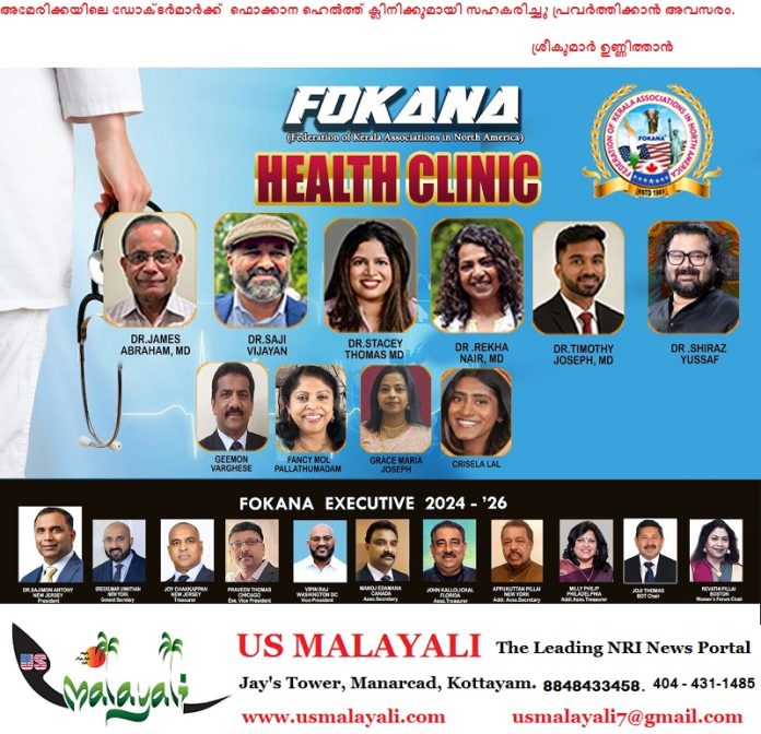 കൺസൾട്ടൻ്റായി അനുഭവപരിചയമുള്ളവരും സ്വന്തമായി ഡോക്ടർ ഓഫീസ് ഉള്ളതായ ഡോക്ടർമാരോ അല്ലെങ്കിൽ ഡോക്ടർസ് ഗ്രൂപ്പോ ,ഫൊക്കാന ഹെൽത്ത് ക്ലിനിക്കുമായി സഹകരിച്ചു പ്രവർത്തിക്കുവാൻ ആഗ്രഹിക്കുന്നവർ ഫൊക്കാന പ്രസിഡന്റ് സജിമോൻ ആന്റണിയുമായി ബന്ധപ്പെടുക (862 – 438-2361 ഓർ email:sajimonantony1@yahoo.com