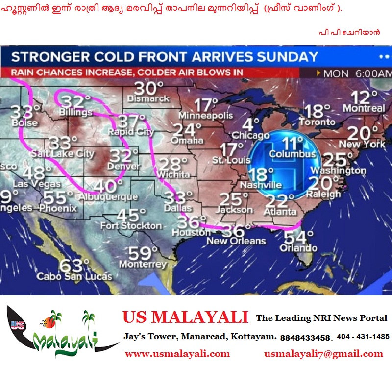 ഹൂസ്റ്റൺ: ഈ വർഷത്തെ ആദ്യത്തെ ‘ഫ്രീസ്’ (മരവിപ്പ് താപനില) ഇന്ന് രാത്രി ഹൂസ്റ്റണിൽ എത്താൻ സാധ്യതയുണ്ടെന്ന് കാലാവസ്ഥാ നിരീക്ഷണ കേന്ദ്രം അറിയിച്ചു. താപനില 32°F (0°C) അല്ലെങ്കിൽ അതിൽ താഴേക്ക് പോകും.