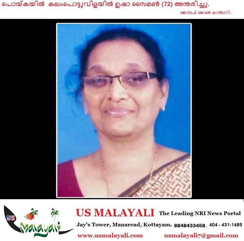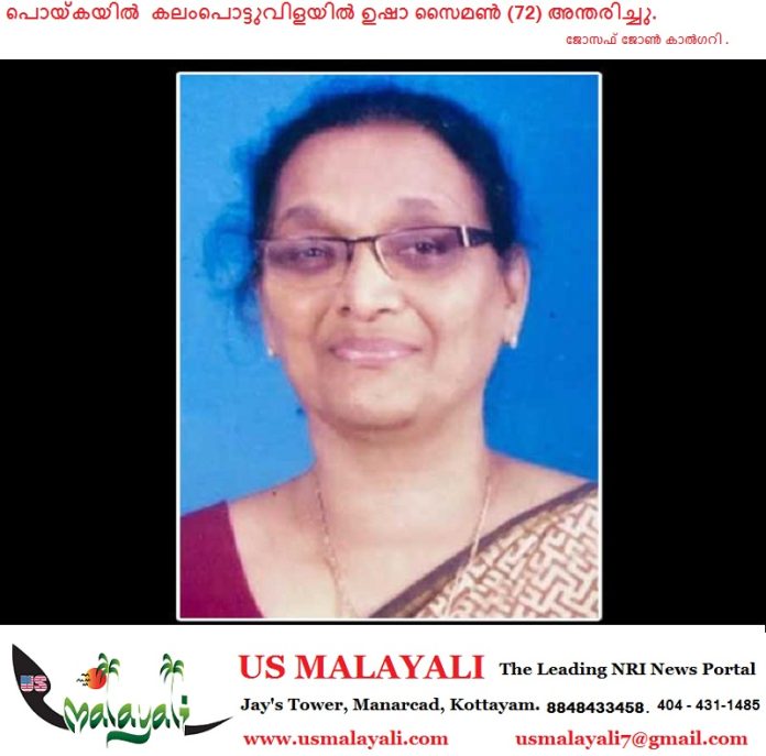 ടൊറന്റോ : കൊച്ചി , കലൂരിൽ, കതൃക്കടവ്, വാദ്ധ്യാർ റോഡിൽ പൊയ്കയിൽ കലംപൊട്ടുവിളയിൽ ഉഷാ സൈമൺ (72) അന്തരിച്ചു. കുണ്ടറ ആറുമുറിക്കട, കലംപൊട്ടുവിളയിൽ തോമസ് സൈമൺ ആണ് ഭർത്താവ് . തുമ്പമൺ വടക്കിടത്തു വീട്ടിൽ അന്തരിച്ച വി.സി തോമസിന്റേയും ,ചിന്നമ്മ തോമസിന്റേയും മൂത്ത മകളാണ് പരേത.