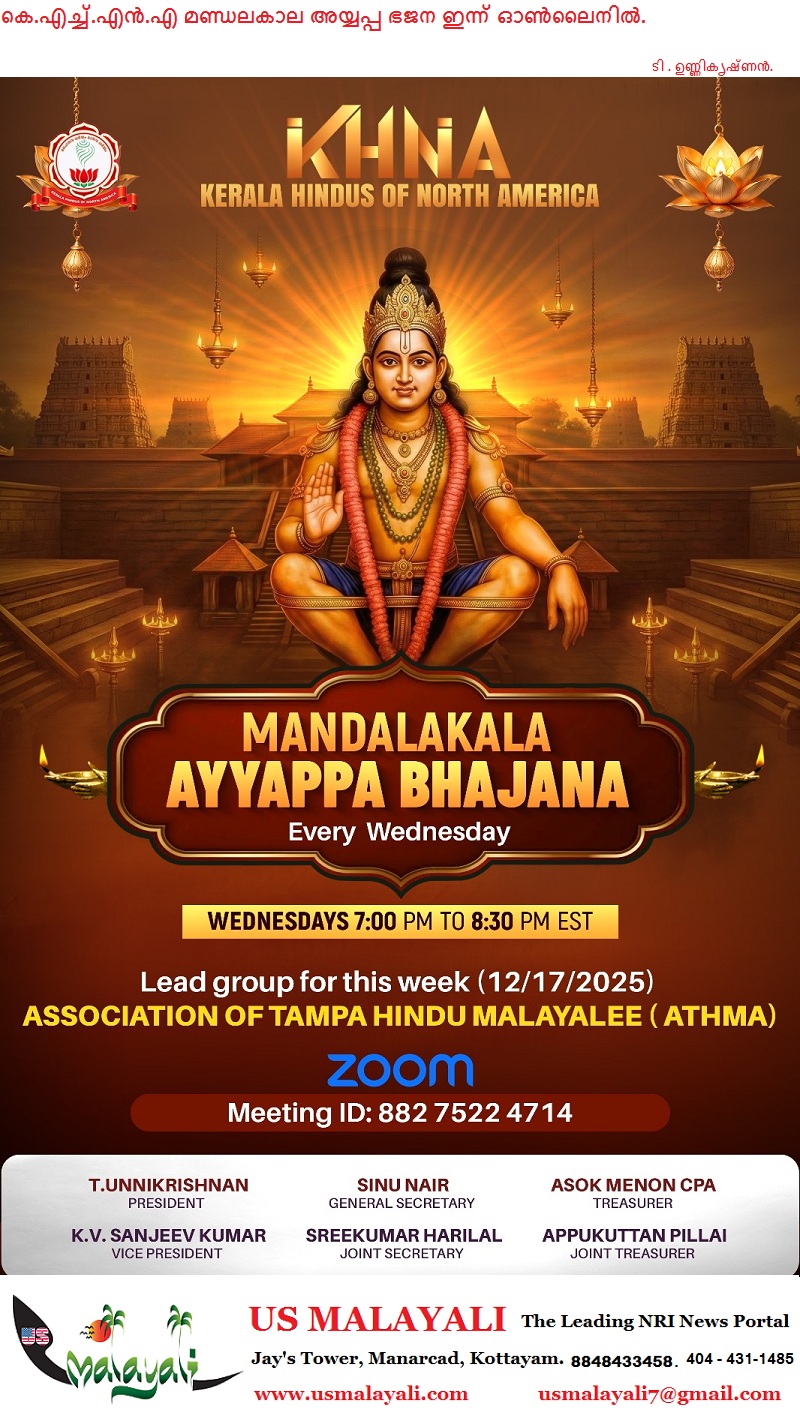 ടാംപ (ഫ്ലോറിഡ): മണ്ഡല-മകരവിളക്ക് തീർത്ഥാടന കാലത്തോടനുബന്ധിച്ച് വടക്കേ അമേരിക്കയിലെ അയ്യപ്പ ഭക്തർക്കായി കേരള ഹിന്ദുസ് ഓഫ് നോർത്ത് അമേരിക്ക (KHNA) എല്ലാ ബുധനാഴ്ചയും ഓൺലൈൻ ‘മണ്ഡലകാല അയ്യപ്പ ഭജന’ നടത്തുന്നു.