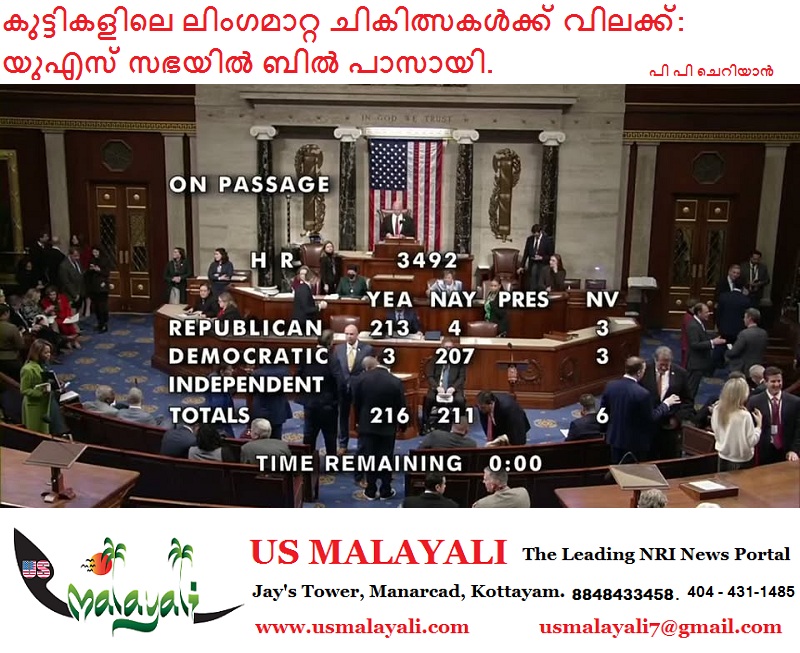 വാഷിംഗ്ടൺ: പ്രായപൂർത്തിയാകാത്ത കുട്ടികളിൽ ലിംഗമാറ്റ ശസ്ത്രക്രിയകളും ഹോർമോൺ ചികിത്സകളും നടത്തുന്നത് ക്രിമിനൽ കുറ്റമാക്കുന്ന ‘പ്രൊട്ടക്ട് ചിൽഡ്രൻസ് ഇന്നസെൻസ് ആക്ട്’ അമേരിക്കൻ ജനപ്രതിനിധി സഭ പാസാക്കി. 211-നെതിരെ 216 വോട്ടുകൾക്കാണ് ബിൽ വിജയിച്ചത്.