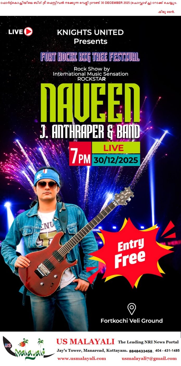 International Music Sensation Rock Star NAVEEN J. ANTHRAPER & BAND എത്തുന്നു. റോക്ക്സ്റ്റാർ നവീൻ ജെ. അന്ത്രപ്പേർ ൻ്റെ ആരാധകരുടെ വൻ പ്രവാഹം ആണ് എത്താൻ പോകുന്നത് ആരാധകർ കാത്തിരുന്ന ദിനം ആണ് 30 December 2025 ഫോർട്ട് കൊച്ചി വെളി ഗ്രൗണ്ടിൻ നടക്കുന്നത് . റോക്ക്സ്റ്റാർ നവീൻ ജെ. അന്ത്രപ്പേർ ആൻ്റ് ബാൻ്റ് ഇംഗ്ലീഷ് റോക്ക് സംഗീതം അവതരിപ്പിക്കുന്ന ഈ സ്പെഷ്യൽ പരിപാടിയിൽ പൊതുജനങ്ങൾക്ക് പ്രവേശനം സൗജന്യമാണ്
