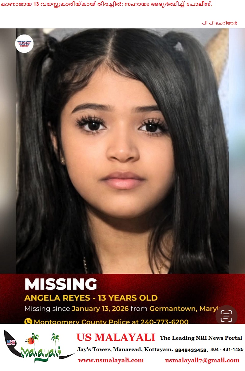 മേരിലാൻഡ്: ജർമ്മൻ ടൗണിൽ നിന്ന് 13 വയസ്സുകാരിയെ കാണാതായതായി റിപ്പോർട്ട്. ഏഞ്ചല റെയസ് (Angela Reyes) എന്ന പെൺകുട്ടിയെയാണ് ജനുവരി 13 മുതൽ കാണാതായത്.